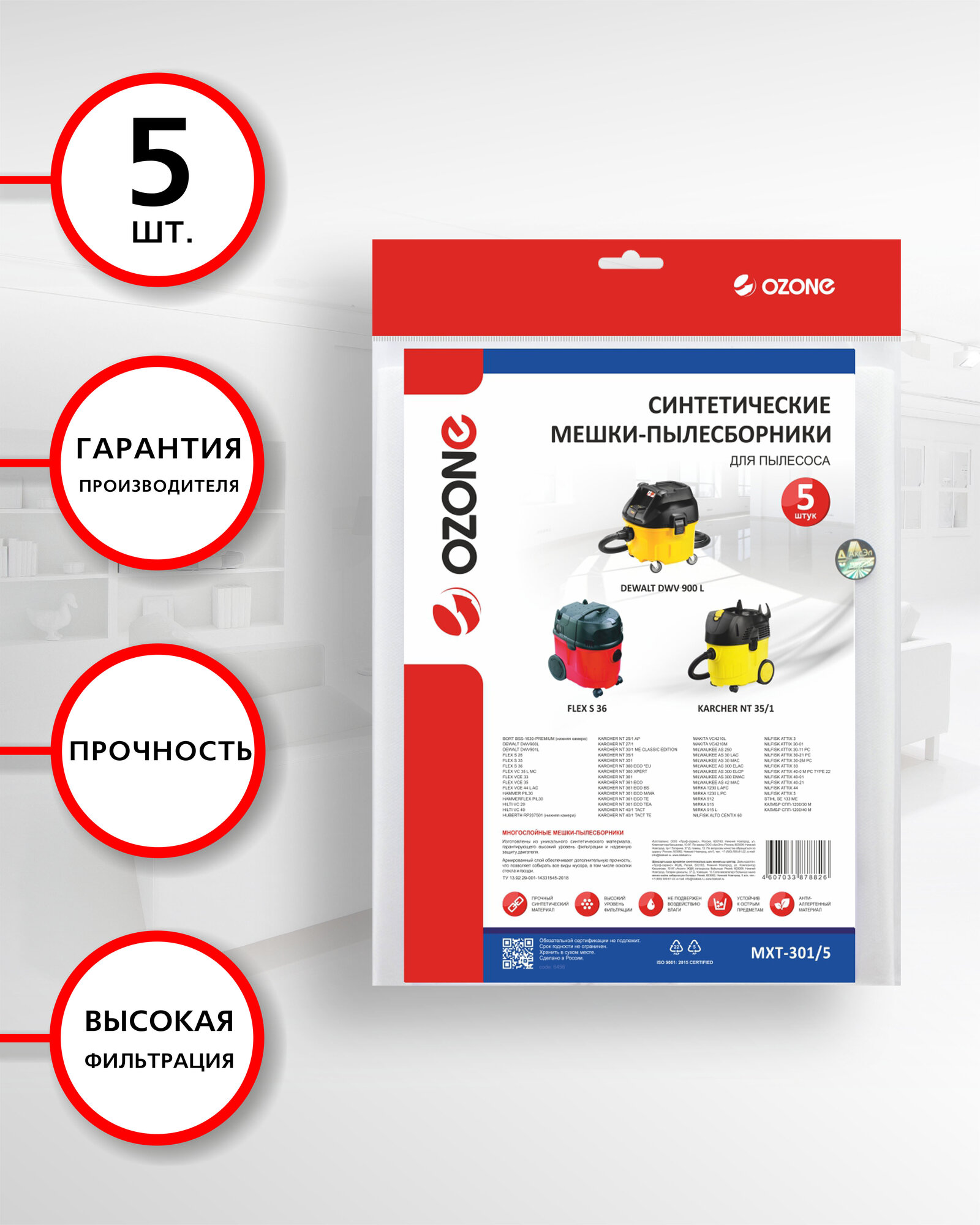 OZONE turbo синтетический мешок-пылесборник для проф.пылесосов 5 шт. до 36 литров MXT-301/5