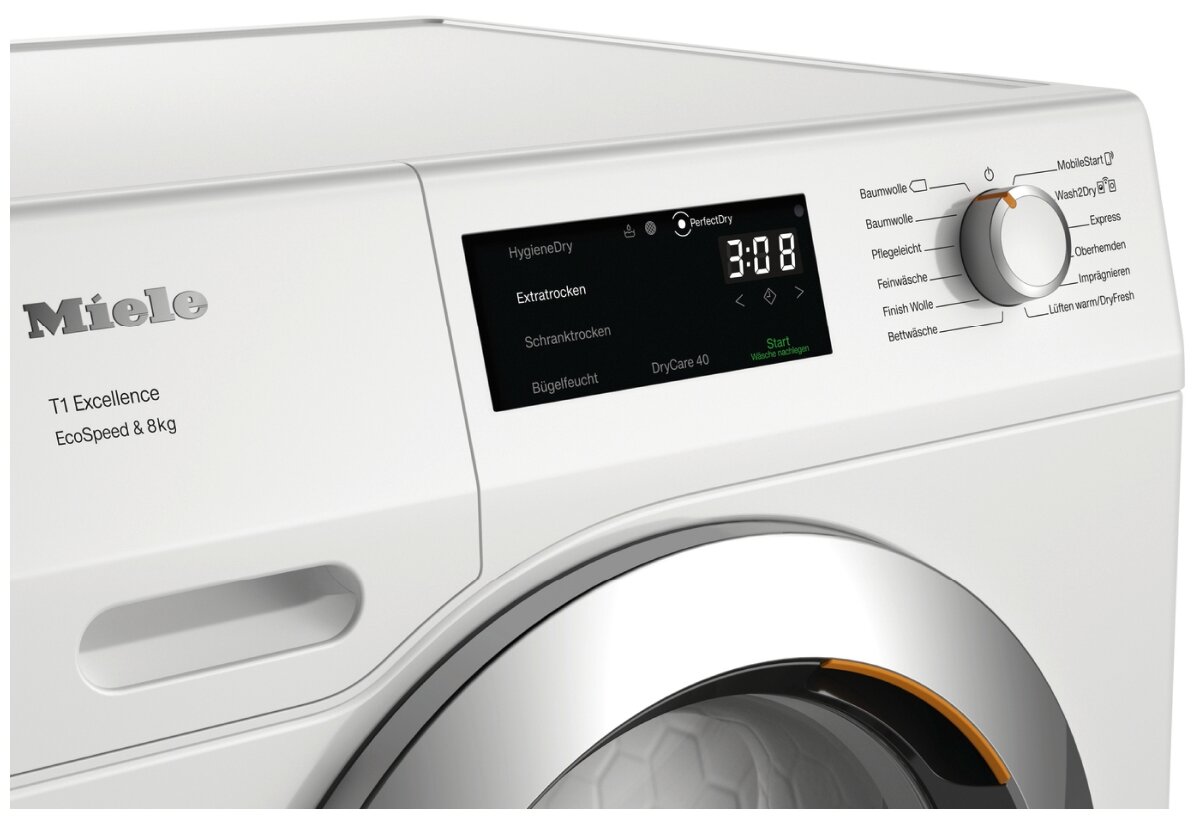 | Дополнительная информация | объединение в сеть с системой Miele@home, блокировка ПИН-кодом, индикация «Вылить конденсат», индикация «Очистить фильтр», длина сетевого кабеля: 2 м; тип хладагента: R290, количество хладагента: 0,14 кг, воздействие хладагента на глобальное потепление: 3 CO₂e; опция DryCare 40: высушивает бельё, выстиранное при 40 °C; функция AddLoad: можно легко добавить или вынуть бельё даже после запуска программы; Wash2Dry: сушильная машина автоматически использует ту же программу, что и стиральная |