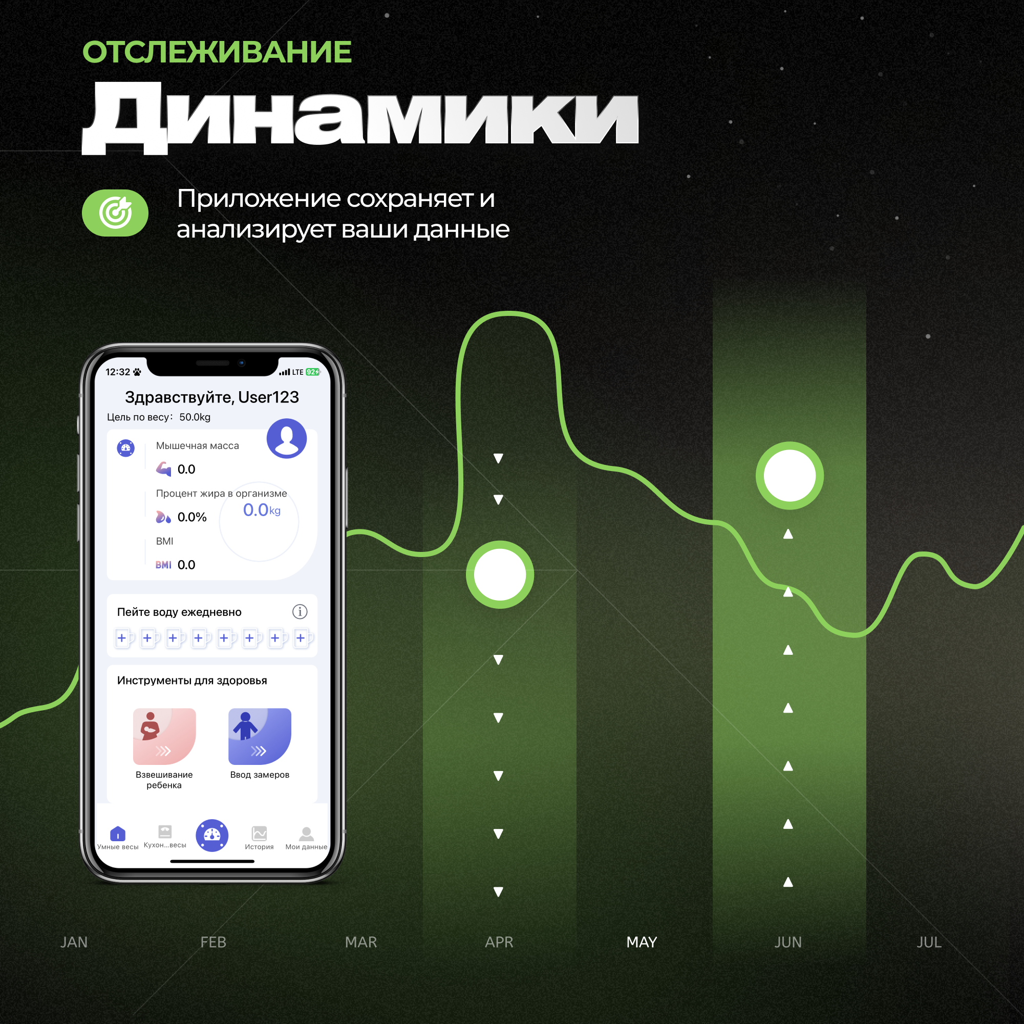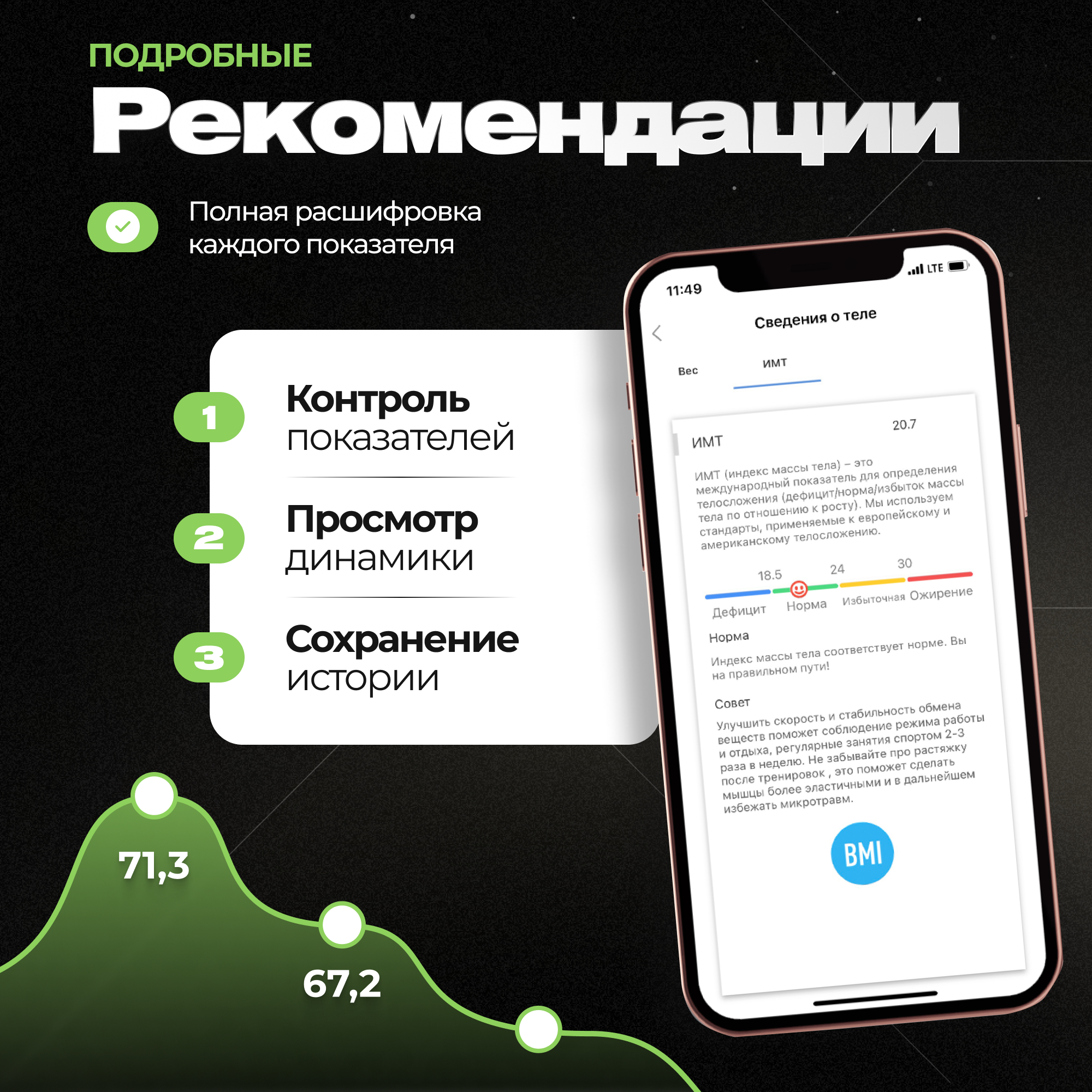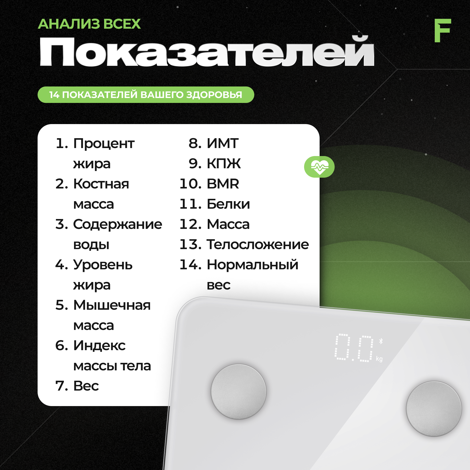 | Дополнительная информация | Комплексный анализ состояния тела; Синхронизируют данные с мобильным приложением; За одно взвешивание весы измеряют 14 важных показателей; Подсветка дисплея; Цветной экран; Выдвижная панель; Высокая точность измерений; Функция автоотключения/ включения; Цветной TFT дисплей |
