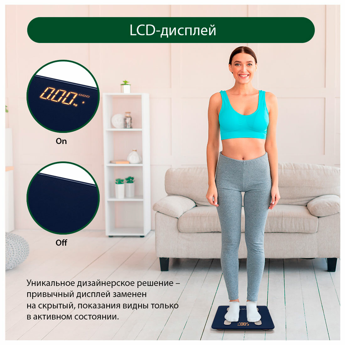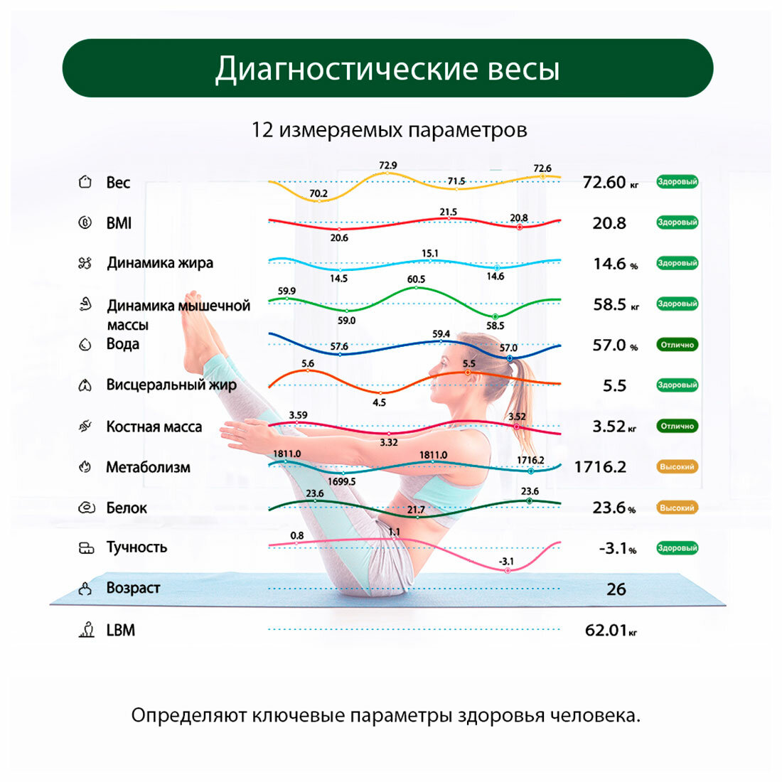 | Дополнительные функции | определение доли воды / определение доли жировой ткани / определение доли костной ткани / определение доли мышечной ткани / память / постановка цели / расчет ИМТ (BMI) |