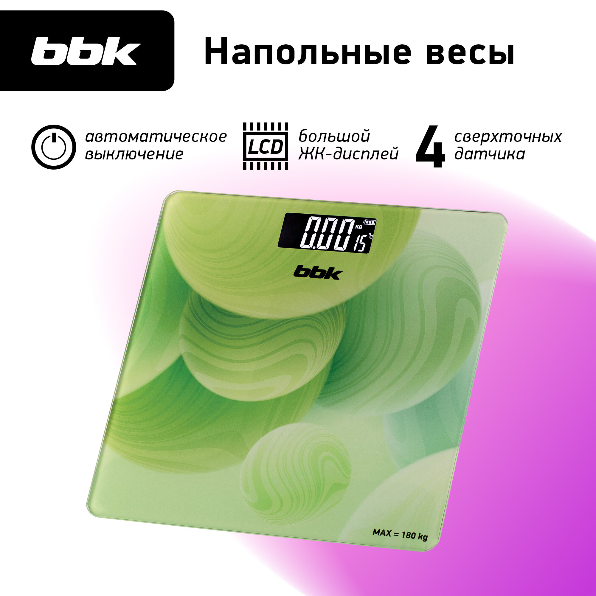 Весы напольные BBK BCS3003G розовый, LCD-дисплей, максимальный вес 180 кг, точность измерения 100 г, автоматическое отключение