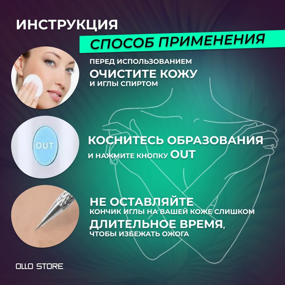 | Способ применения | Перед использованием очистите кожу и иглы спиртом. Коснитесь образования и нажмите кнопку OUT. Не оставляйте кончик иглы на вашей коже слишком длительное время, чтобы избежать ожога. |