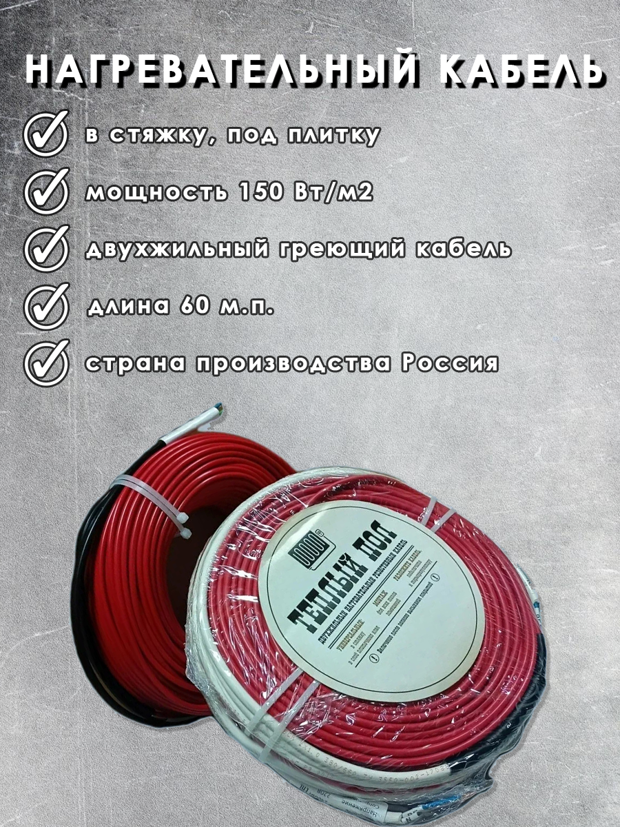 Купить Теплый пол.Двухжильный нагревательный кабель 15 Вт/м.п под плитку, в стяжку 60м.п.