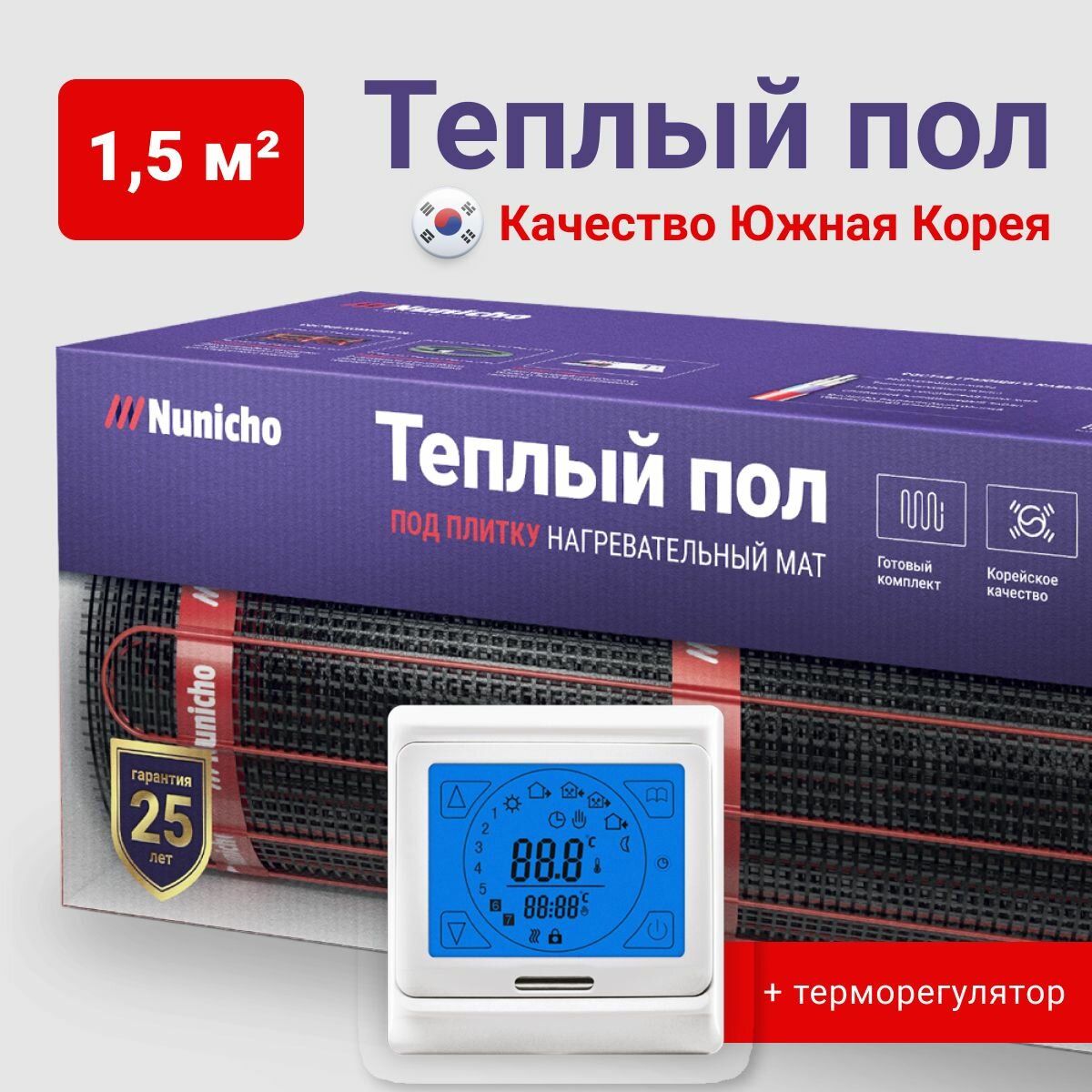 Теплый пол под плитку в стяжку NUNICHO 1,5 м2, 200 Вт/м2 с программируемым серебристым терморегулятором электрический нагревательный мат