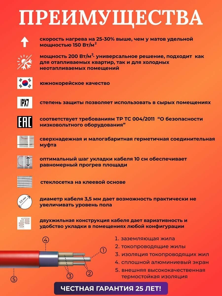 Теплый пол электрический под плитку 15 м2 Nunicho 200 Вт/м2 с терморегулятором программируемым черным, нагревательный мат пр-во Южная Корея