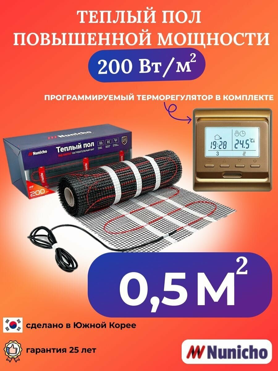 Теплый пол электрический под плитку 0,5 м2 Nunicho 200 Вт/м2 с терморегулятором программируемым золотистым, нагревательный мат пр-во Южная Корея