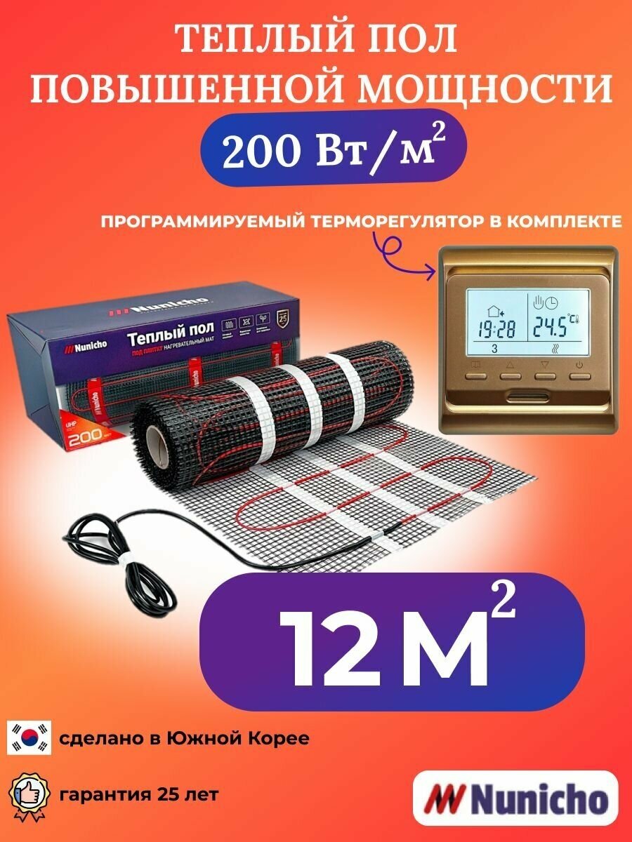 Теплый пол электрический под плитку 12 м2 Nunicho 200 Вт/м2 с терморегулятором программируемым золотистым, нагревательный мат пр-во Южная Корея