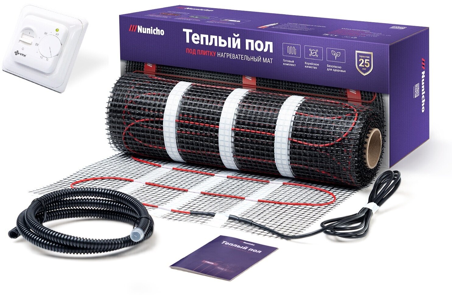 Теплый пол электрический под плитку Nunicho 1 м2 нагревательный мат в стяжку с механическим белым терморегулятором в комплекте