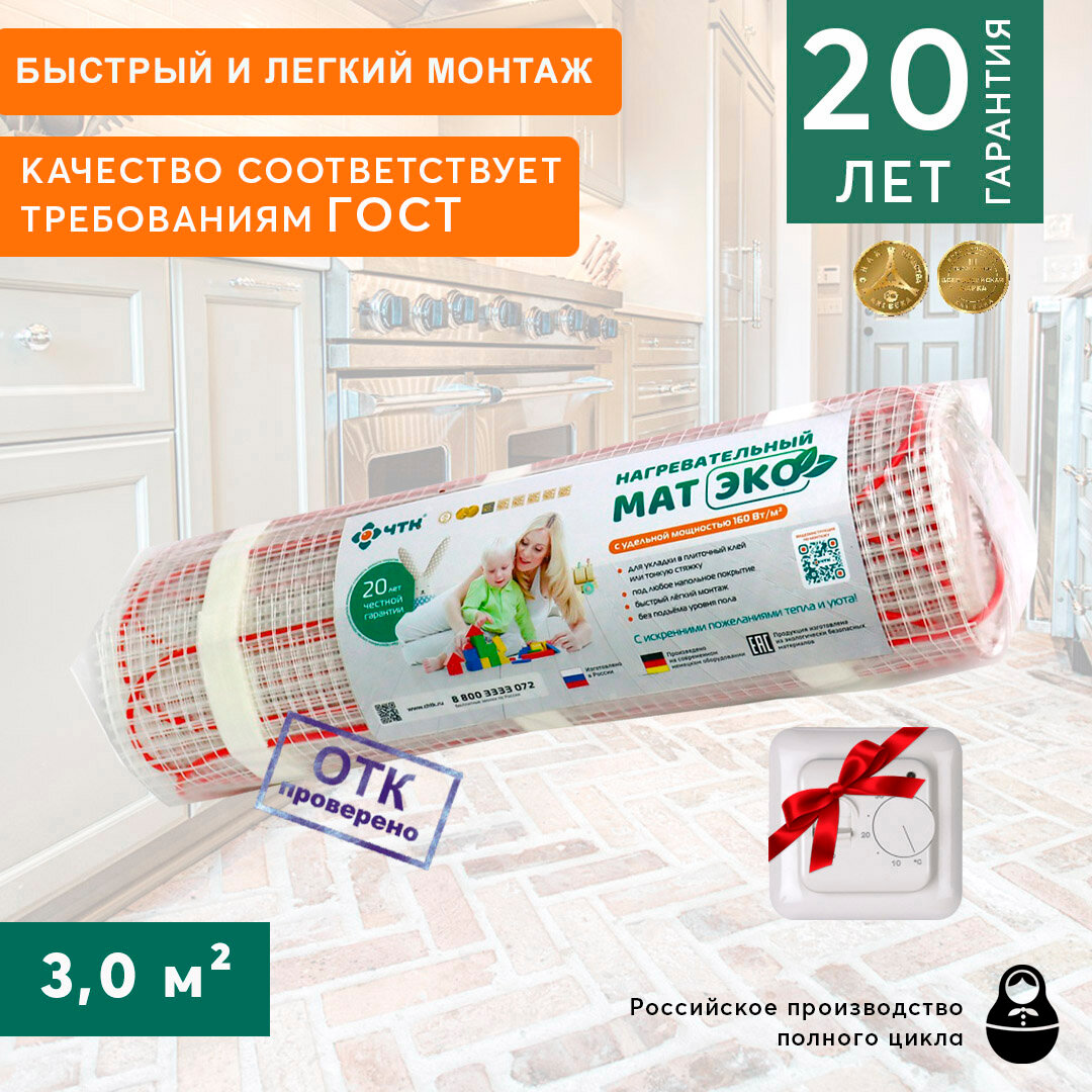 Теплый пол ЧТК ЭКО. Нагревательный мат 3 кв.м., с механическим терморегулятором.