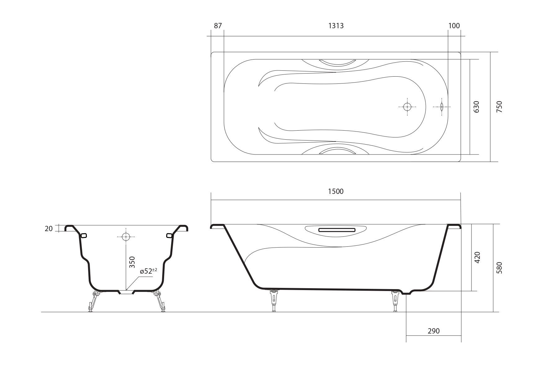 AQ8050FH-00 гамма ванна чугунная эмалированная 1500x750 в комплекте с 4-мя ножками и 2-мя ручками