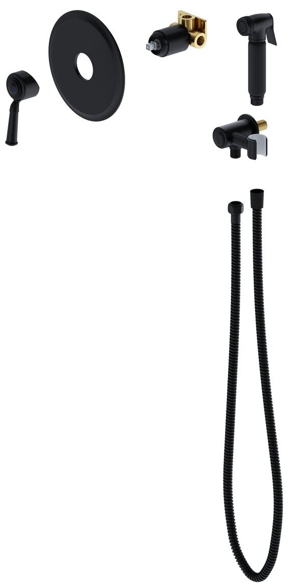 | Комплектация | смеситель скрытого монтажа- 1 шт. / декоративная накладка - 1 шт. / шланг душа 1,2 м - 1 шт. / гигиеническая лейка - 1 шт. / отвод из стены - держатель лейки - 1 шт. / ручка смесителя - 1 шт. |