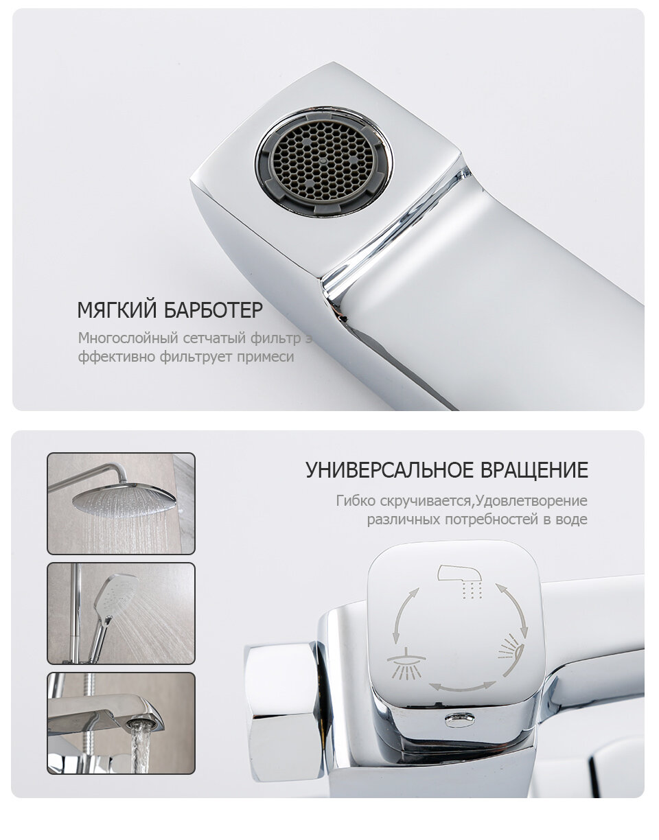 | Особенности | S-образные эксцентрики / антиизвестковое покрытие / аэратор / держатель душевой лейки / защита от скручивания / регулируемый верхний душ |