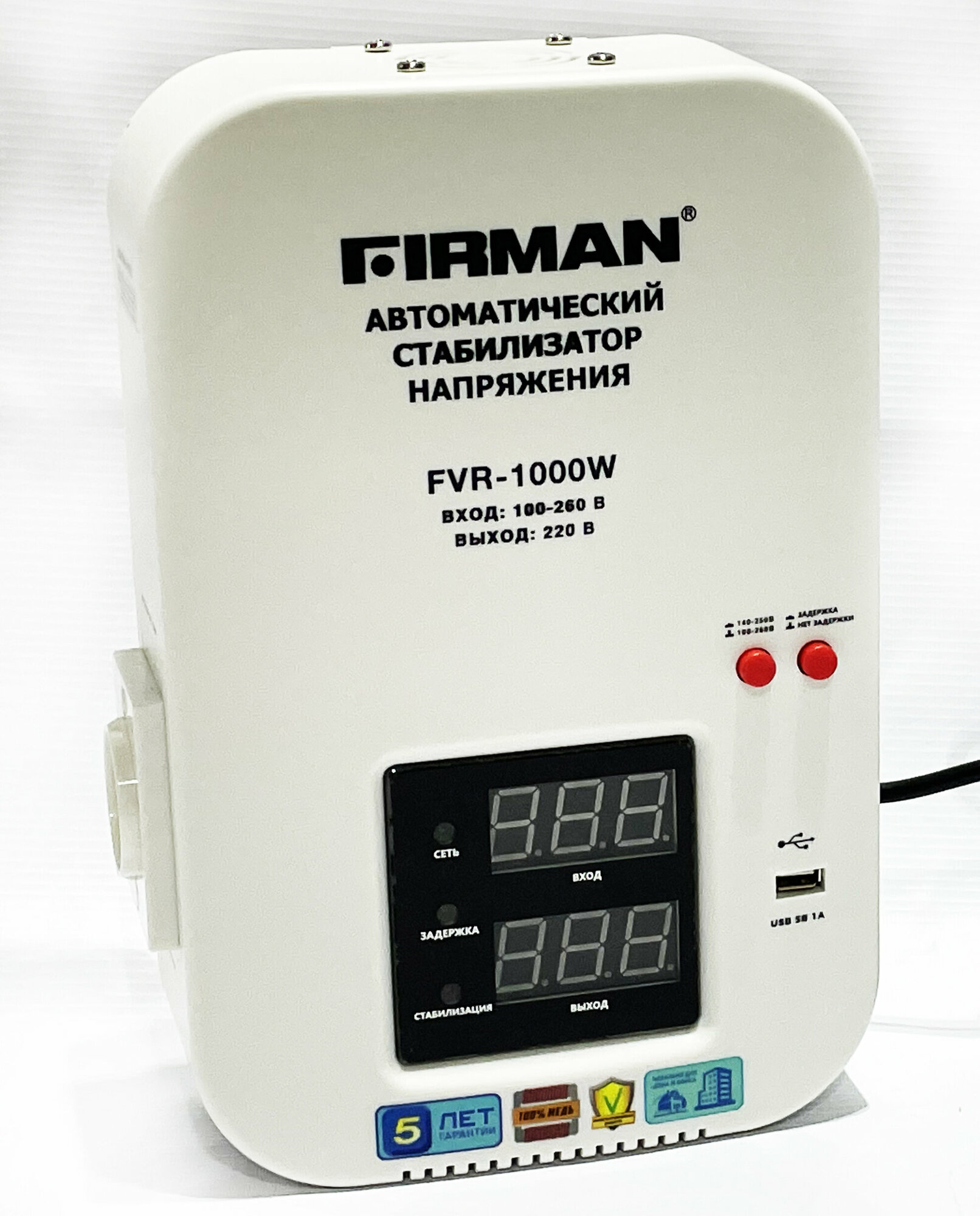 Стабилизатор FIRMAN FVR-1000W (однофаз., релейный, настенный; цифр.дисплей, светодиодн.идикация; шнур/розетка; 1000Вт, 100-260В, USB, 3,2кг)