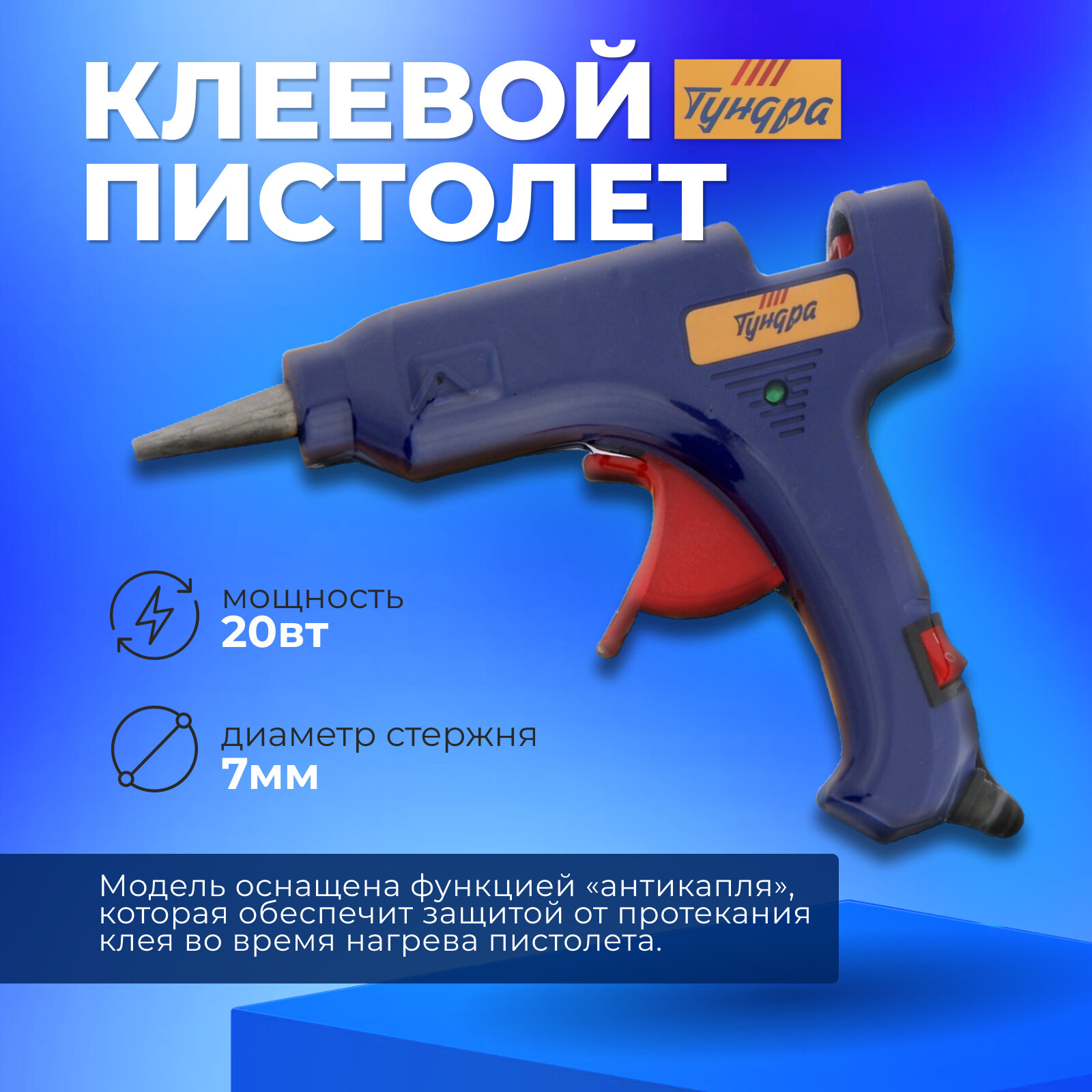 Клеевой пистолет TUNDRA, 20 Вт, 220 В, шнур 1.2 м, выключатель, индикатор, антикапля, 7 мм