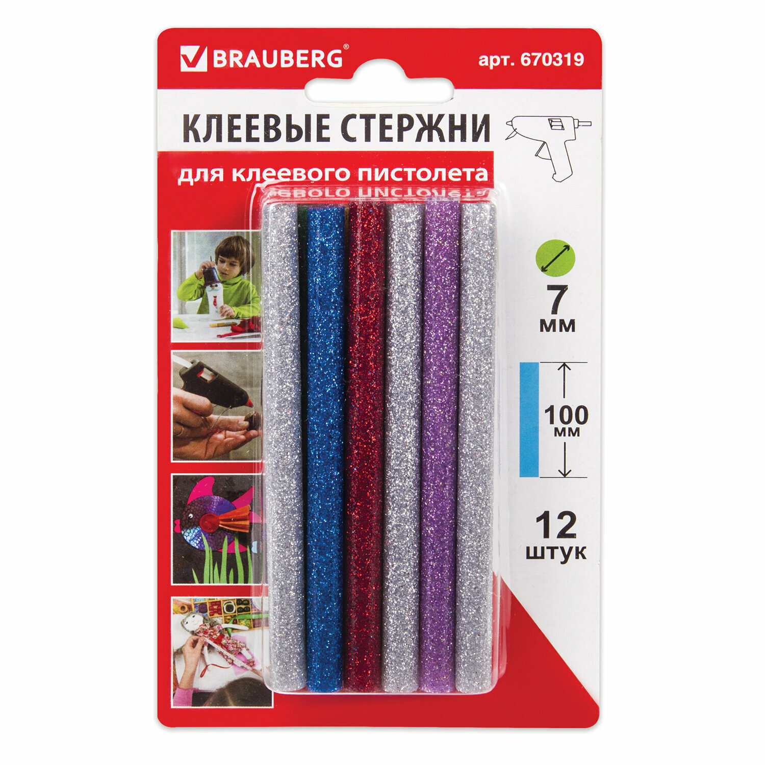 Клеевые стержни, диаметр 7 мм, длина 100 мм, цветные (ассорти), С блестками, комплект 12 шт., 6 цветов, BRAUBERG, 670319 2 шт. интересное: