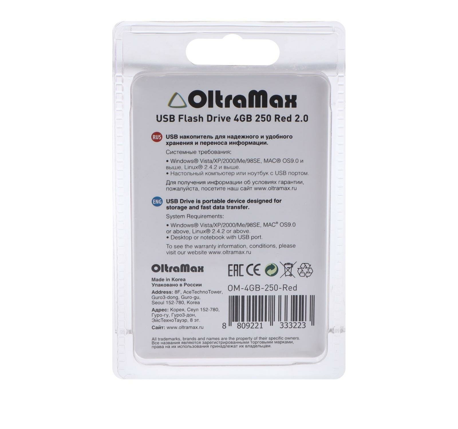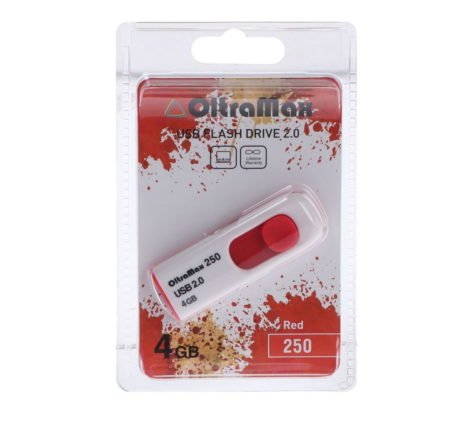 Купить Флешка OltraMax 250, 4 Гб, USB2.0, чт до 15 Мб/с, зап до 8 Мб/с, красная
