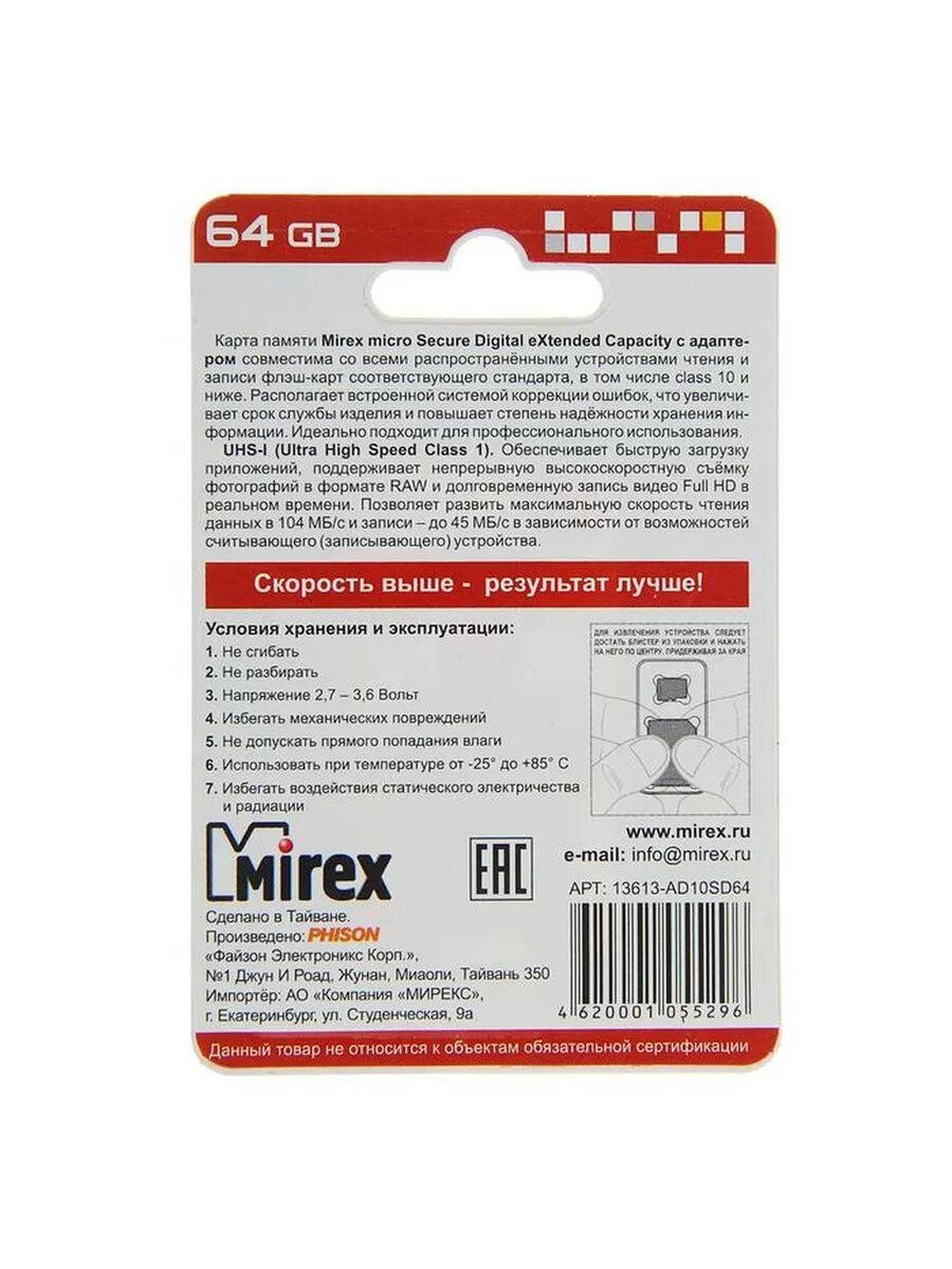 Ниже Вы можете прочитать отзывы на Карта памяти Mirex microSD, 64 Гб, SDXC, UHS-I, класс 10, с адаптером SD Mirex 1910888 ., ознакомится с подробными характеристиками, посмотреть интересные обзоры и фотографии на Карта памяти Mirex microSD, 64 Гб, SDXC, UHS-I, класс 10, с адаптером SD Mirex 1910888 ..