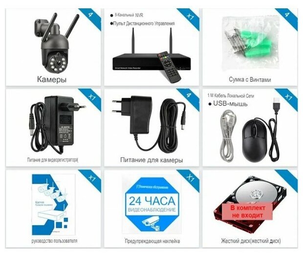 | Подробная комплектация | 1 х 8CH 3MP Беспроводной NVR; 4 x 3MP WI-FI камеры; 1 x Блок питания для NVR; 4 x адаптер для камеры (3 метра); 1 x 1м Lan кабель для NVR; 1 х USB мышь; 4 x Комплект винтов; 1 х пульт дистанционного управления; 2 x Предупреждающие стикеры; Документация. |