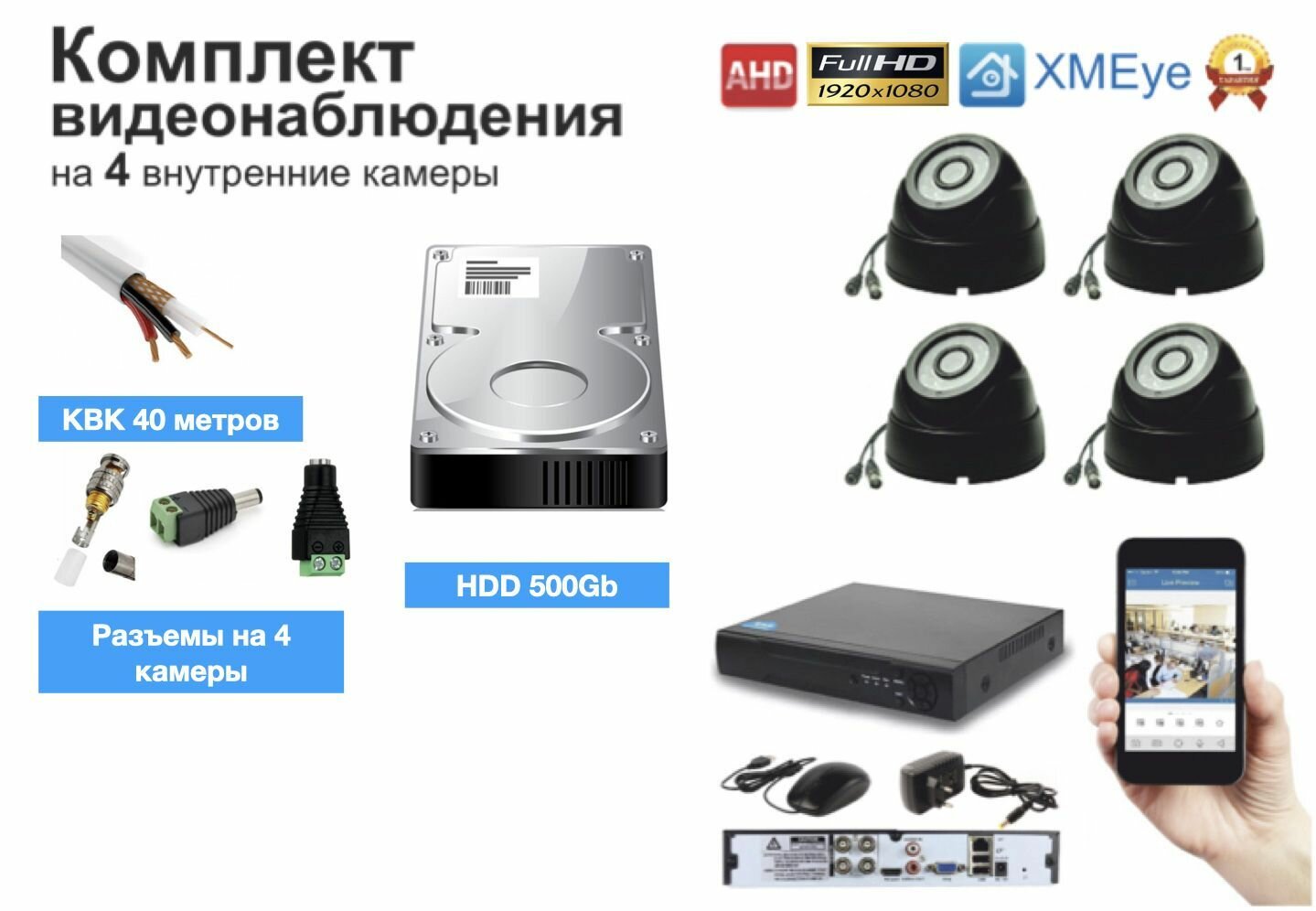 Полный готовый комплект видеонаблюдения на 4 камеры Full HD (KIT4AHD300B1080P_HDD500Gb)