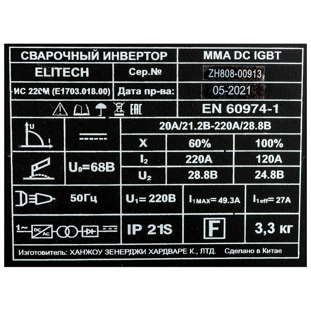 Elitech ИС 220М (e1703.018.00) Сварочный аппарат инверторный (198715)