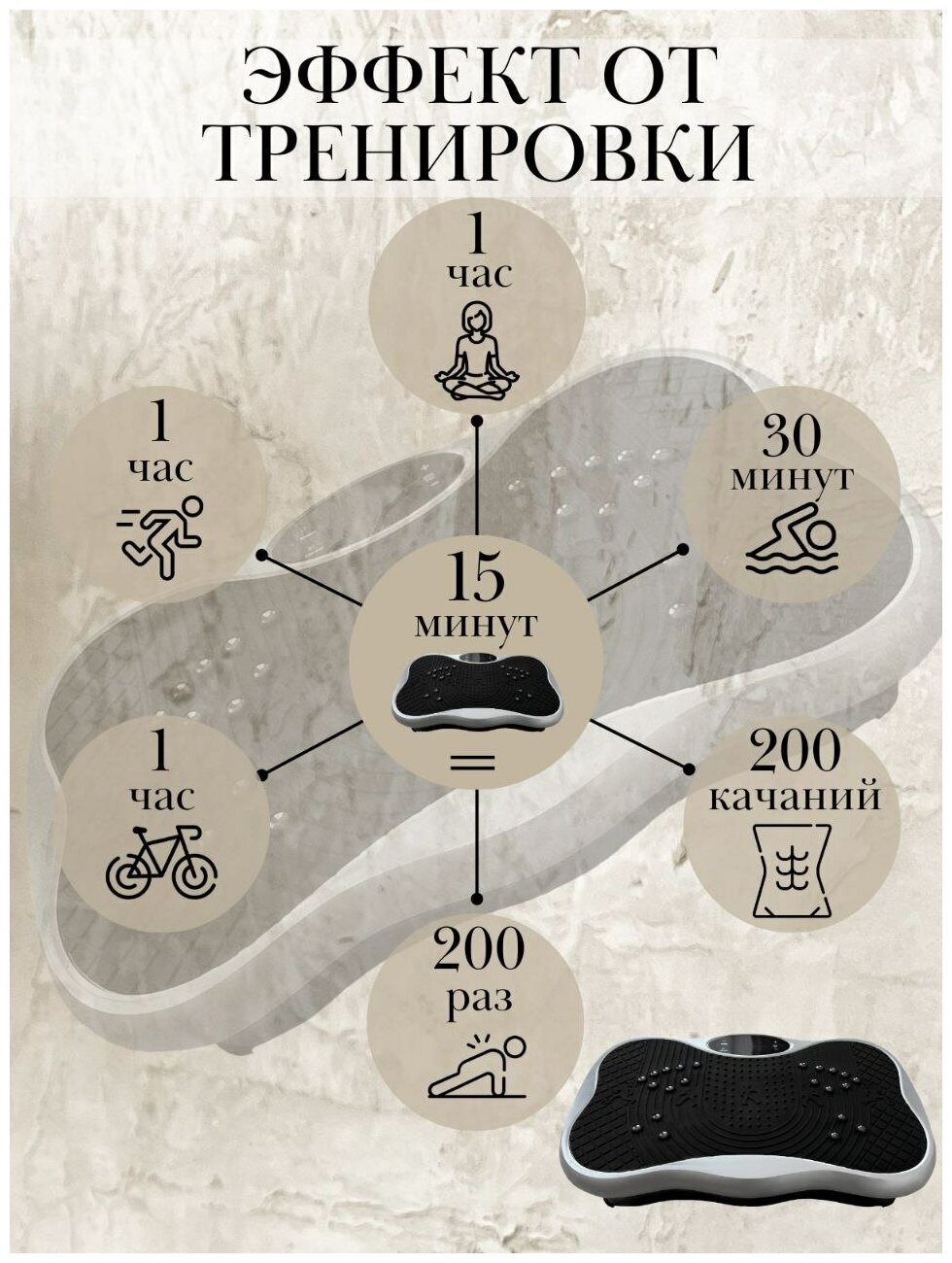 | Особенности | дисплей / компенсатор неровностей пола / программы тренировок / пульт ДУ / регулировка амплитуды колебаний / регулировка частоты вибрации / ручное управление / таймер / эспандеры |