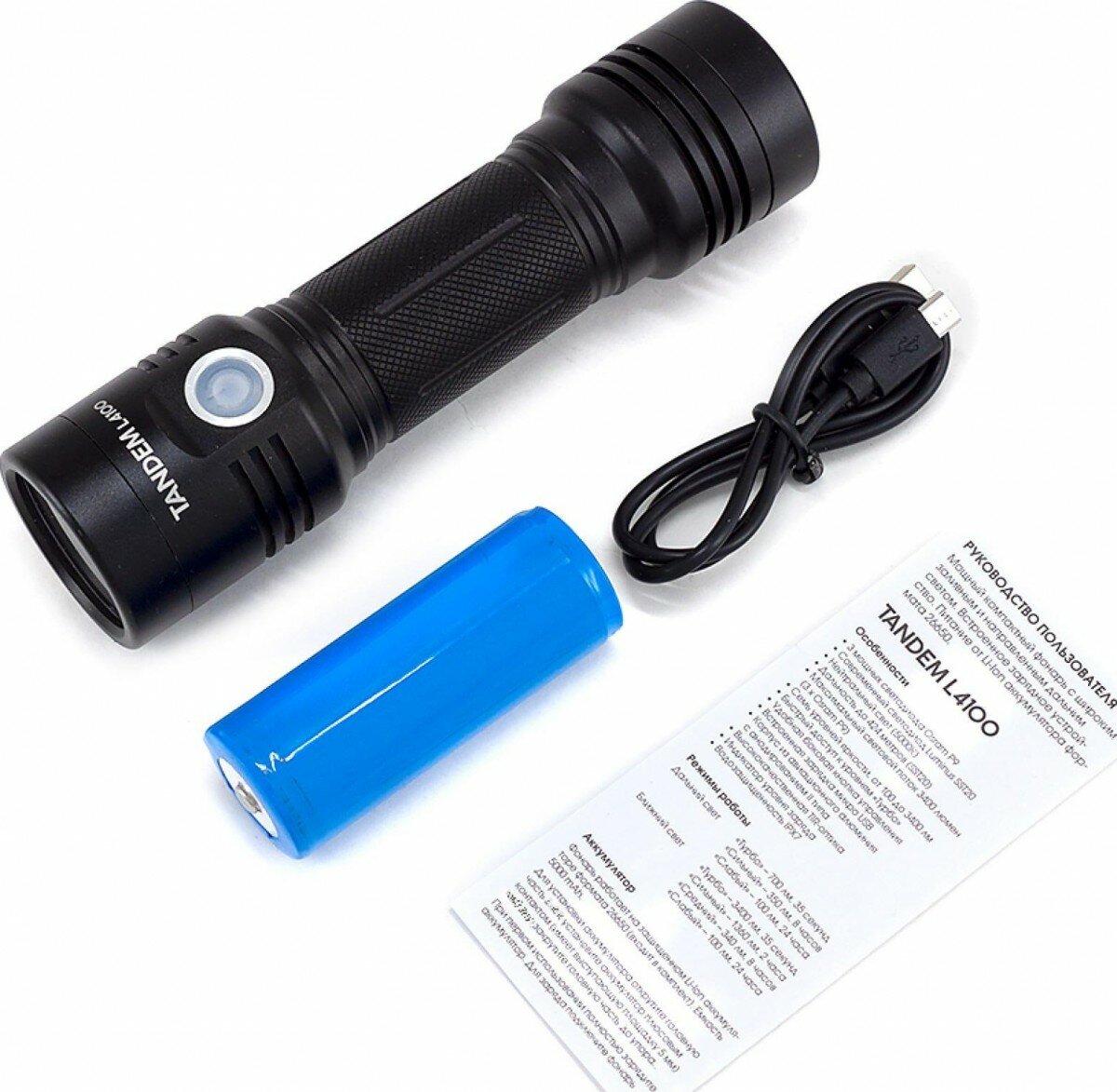 | Подробная комплектация | Фонарь / Аккумулятор 26650 5000 мАч / USB-кабель |