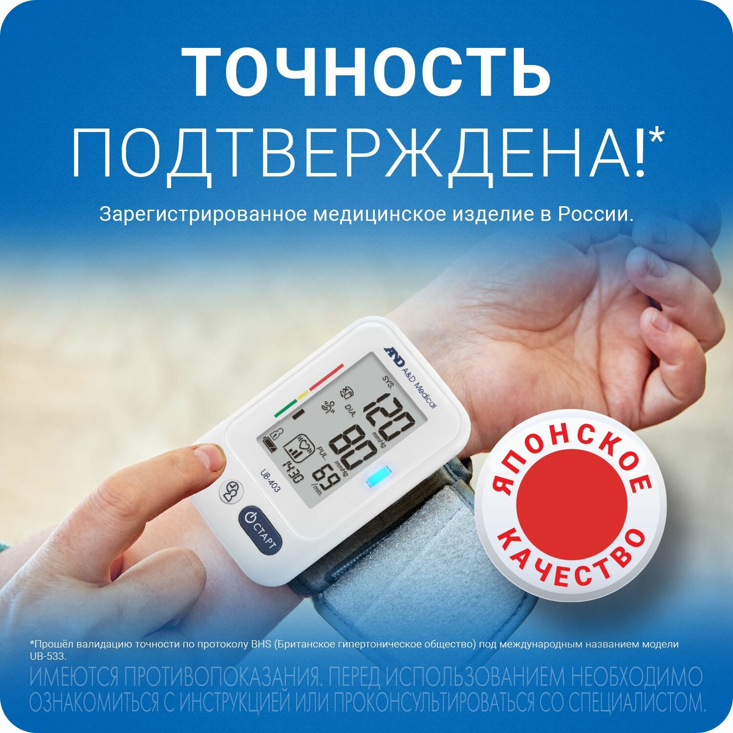 Тонометр автоматический на запястье AND UB-403 с возможностью измерения при мерцательной аритмии и индикатором правильного положения руки