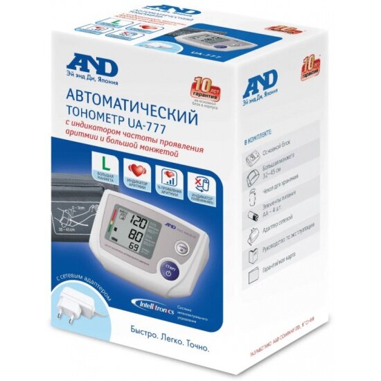 Автоматический тонометр AND UA-777 с большой манжетой / технология IntelliSense / память на 30 измерений / индикатор аритмии / дисплей с подсветкой