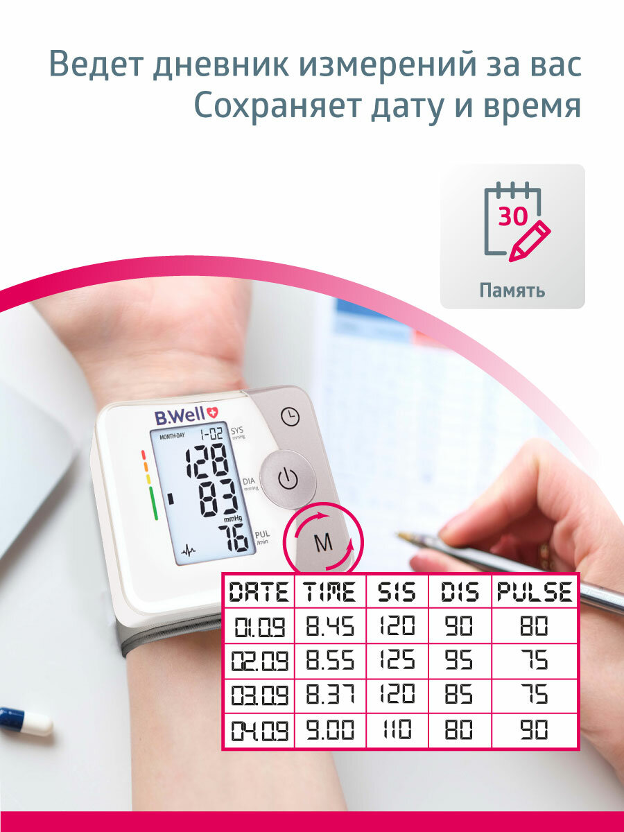 Тонометр B.Well MED-57 на запястье, подсветка дисплея, дневник измерений, индикатором аритмии, шкала