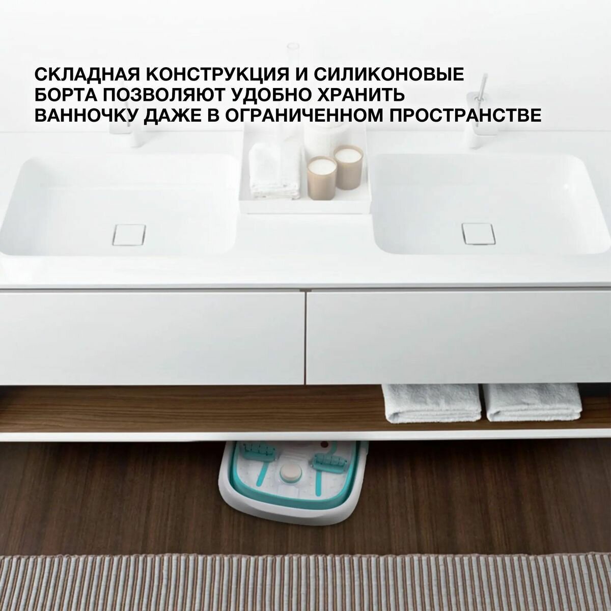 Хорошая ванночка. Размеры компактные, так что места для хранения найти будет не сложно. Пользуюсь каждый день, по мин 10-15 и хочу сказать что хороший результат будет виден только при частом использовании. Мой 38 размер спокойно вмещается, да и места еще остается с запасом.
