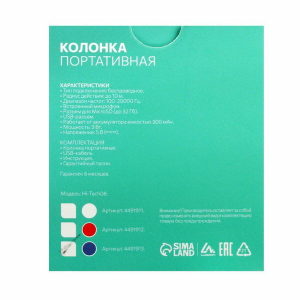 Портативная колонка LuazON Hi-Tech08, 3 Вт, 300 мАч, microSD, USB, синяя интересное: