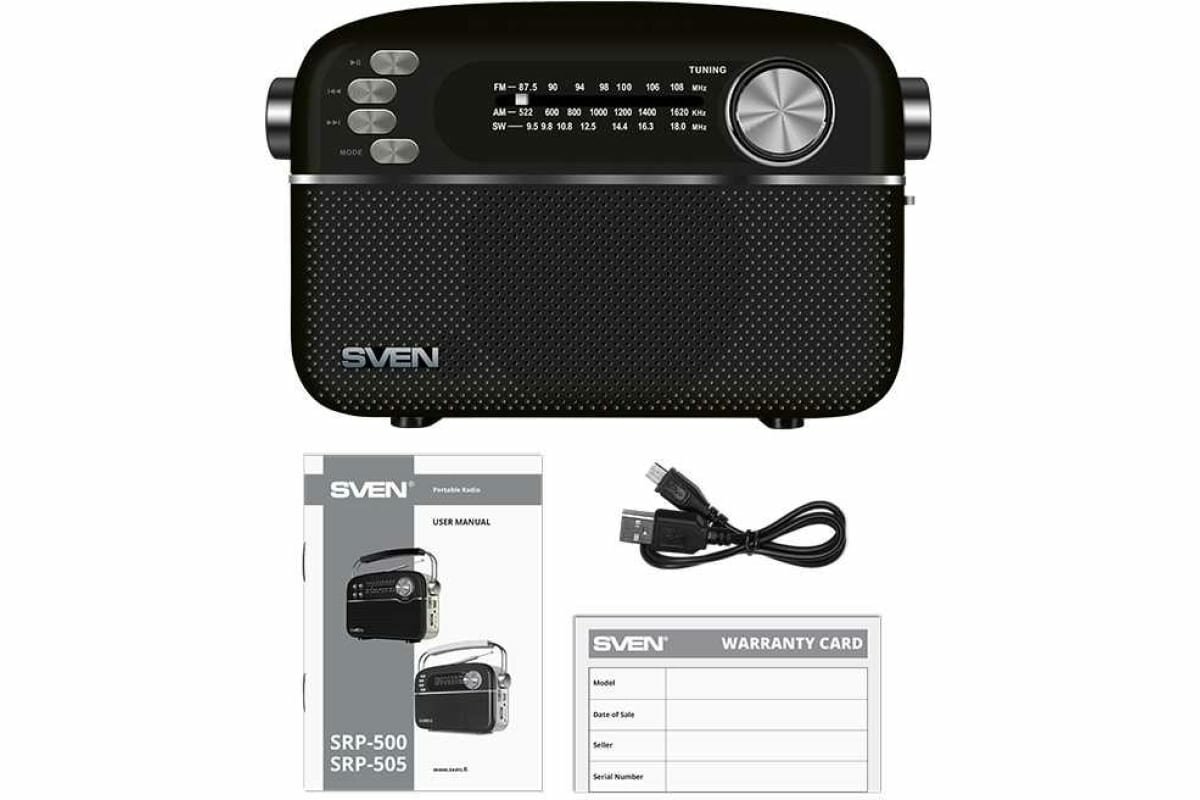Радиоприёмник SVEN SRP-505 чёрный (4 Вт, FM/AM/SW, USB, SD/microSD, Bluetooth, 1200 мАч)