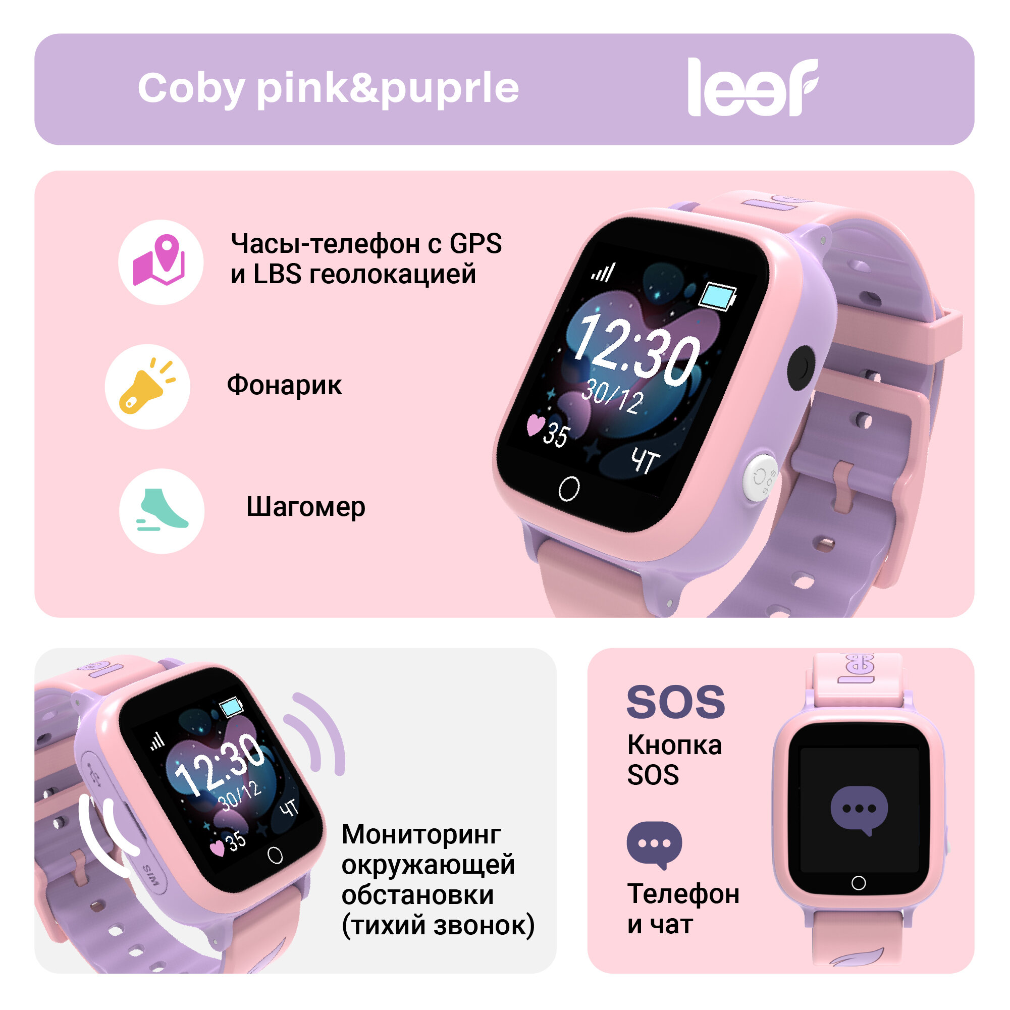Детские умные часы LEEF Coby, цвет розовый + лиловый интересное: