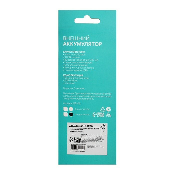 Luazon Home Внешний аккумулятор LuazON PB-05, 6000 мАч, 3 USB, 2 А, дисплей, фонарик, белый интересное: