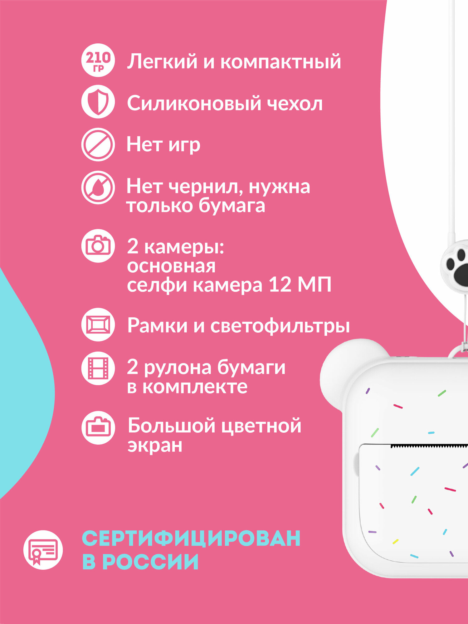 | Отзыв: | Очень интересное решение с моментальной печатью на термобумаге. Выбирал между полароидом или вроде того, но тут больше плюсов оказалось. По ощущениям ребёнок даже спустя год периодически берётся и ходит фоткает. Можно фотографировать на карту, а потом купить рулон и распечатать нужные кадры |
