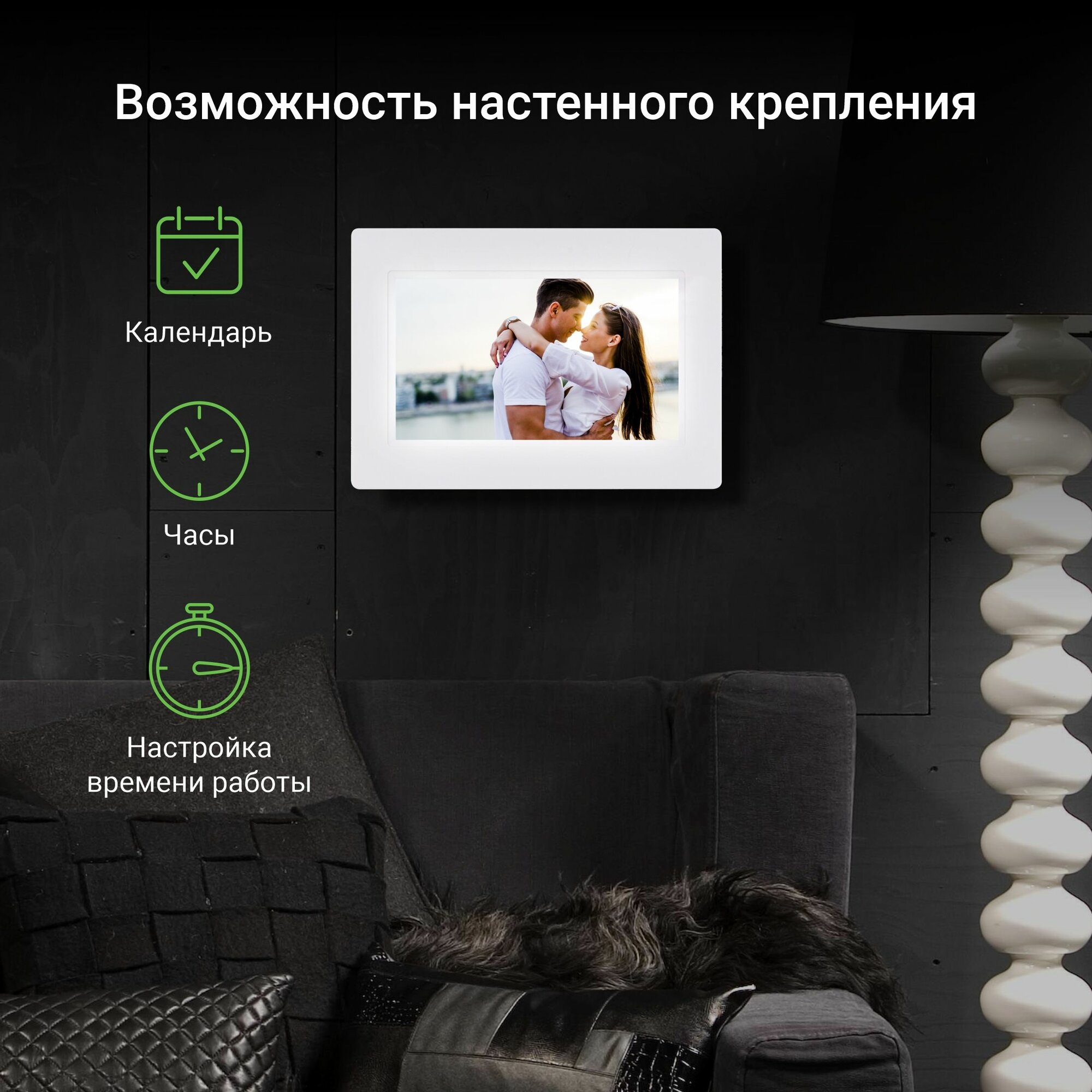| Плюсы: | Белый цвет, диагональ 7 дюймов, похожа на настоящую фоторамку. |