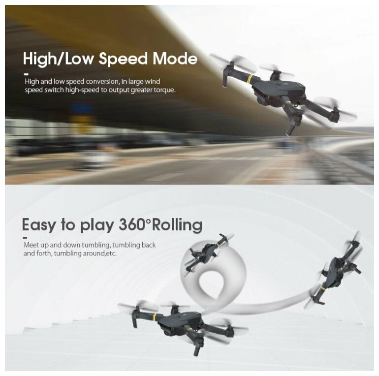 | Дополнительная информация | Полная комплектация: · 1 x Eachine E58 Радиоуправляемый дрон · 1 x пульт управления · 3x3,7 В аккумулятора (500 мАч) · 1 х usb кабель для зарядки аккумуляторов · 4 x защитных крышки · 4 х запасных пропеллера · 1 х отвертка · 1 х руководство пользователя |