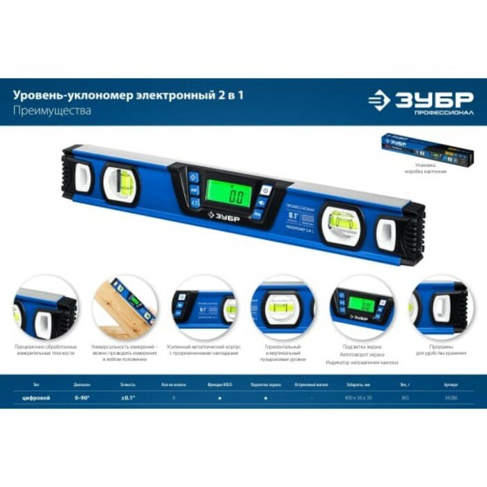 Купить Горизонт уровень-уклономер, 400 мм, Диапазон 0-90°, Точность ±0,1°, Подсветка экрана, ЗУБР Профессионал