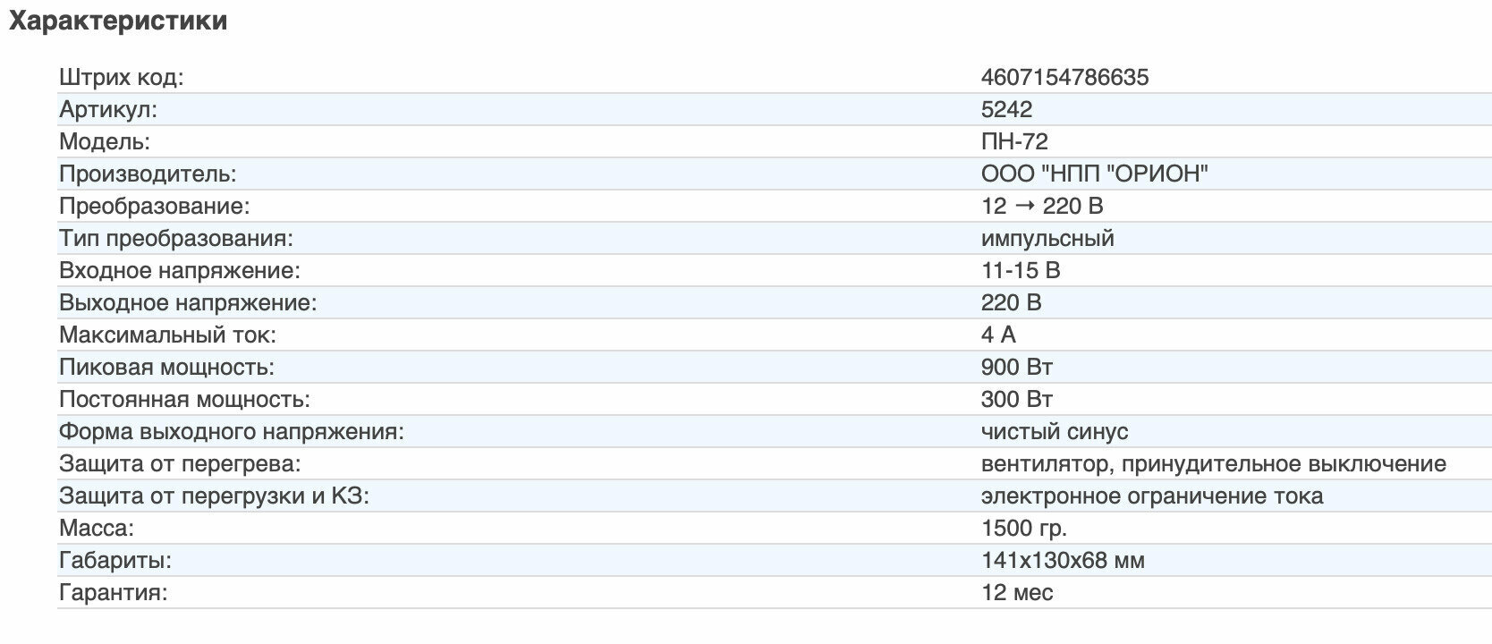 Нпп-орион ПН-72 Преобразователь напряжения (инвертор) 12-220V 900Вт чистая синусоида вымпел
