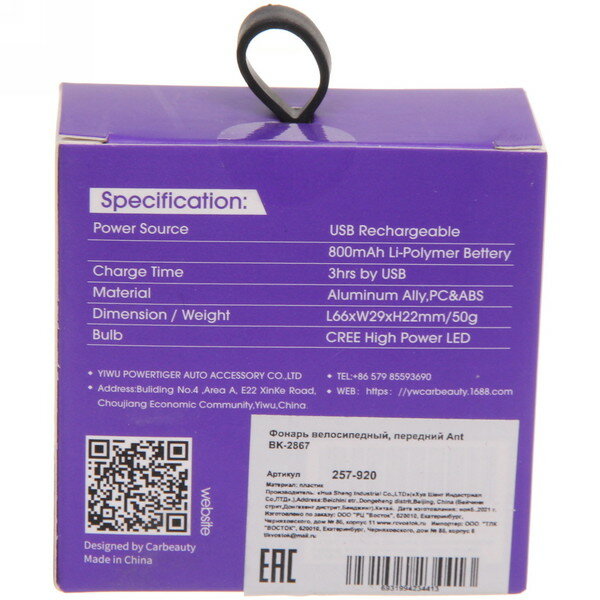 Фонарь велосипедный, передний Ant BK-2867 интересное: