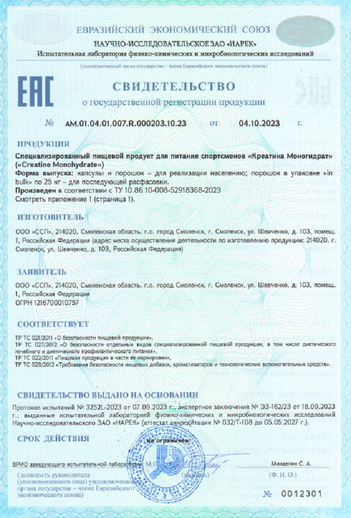 | Дополнительная информация | размер порции: 5.5 шт.; энергетическая ценность на 100 г: 0; рекомендации по применению: Продолжительность приема: не более 4 недель, повторный прием через 2 недели.; состав: Креатин моногидрат |