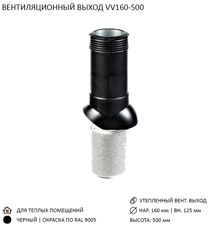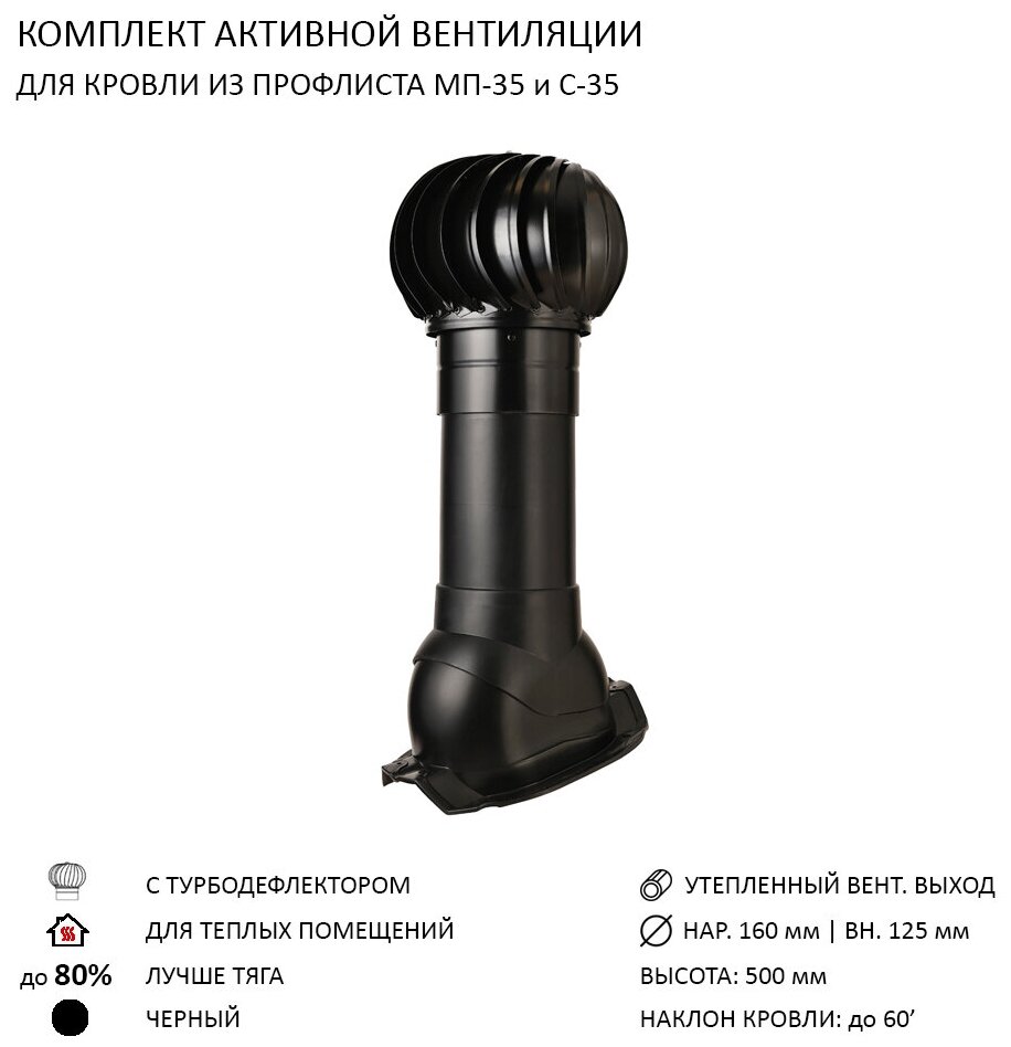 Комплект активной вентиляции: Турбодефлектор TD160, вент. выход утепленный высотой Н-500, для кровельного профнастила 35 мм, черный интересное: