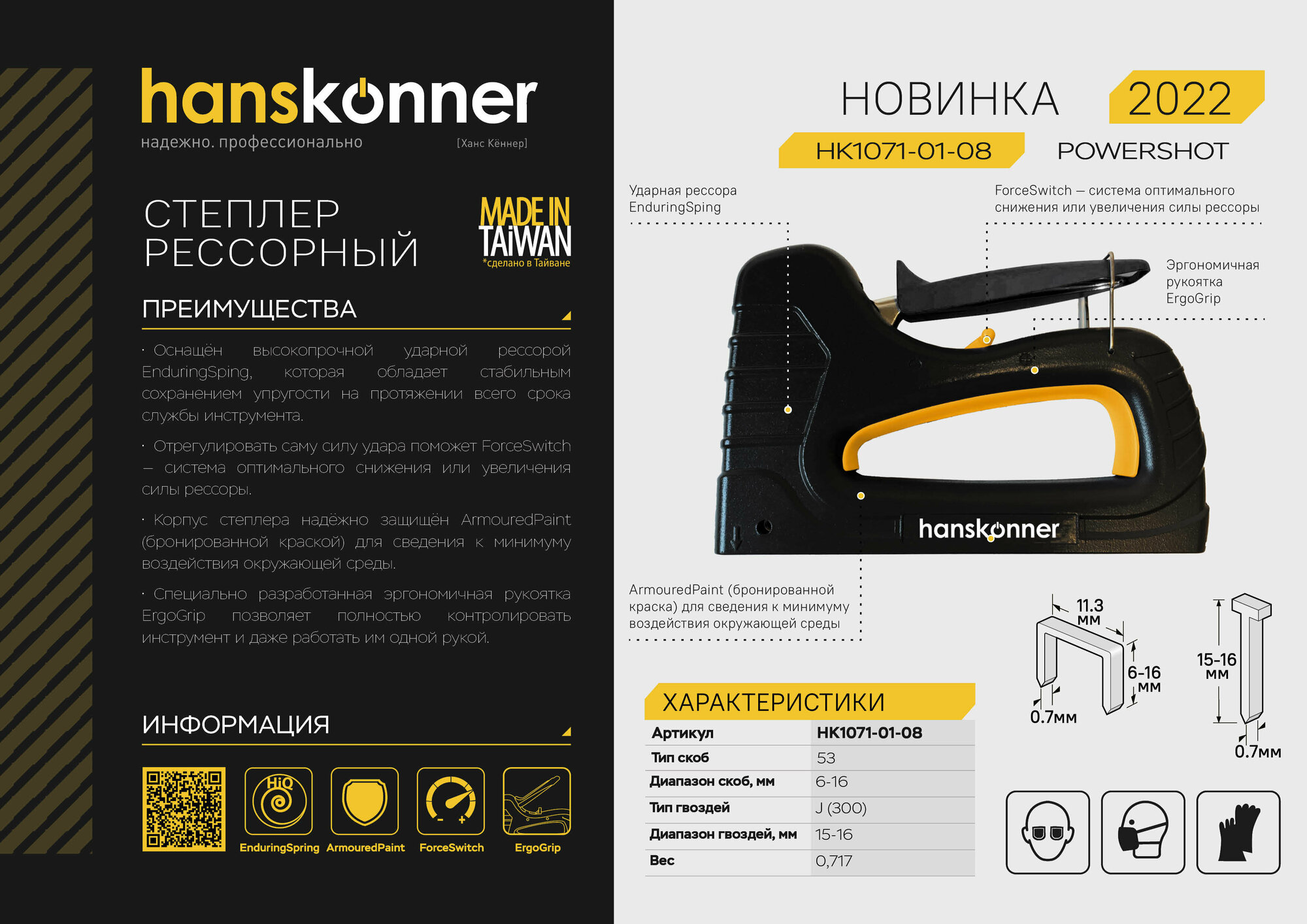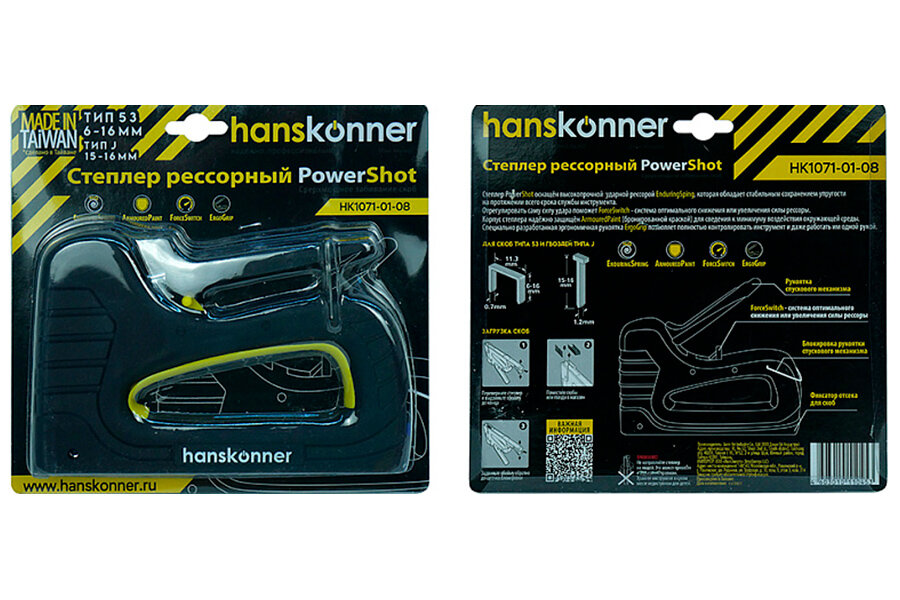 Степлер Hanskonner HK1071-01-08 усиленный, рессорный, скобы 53(6-16мм), гвозди 300(15-16мм)