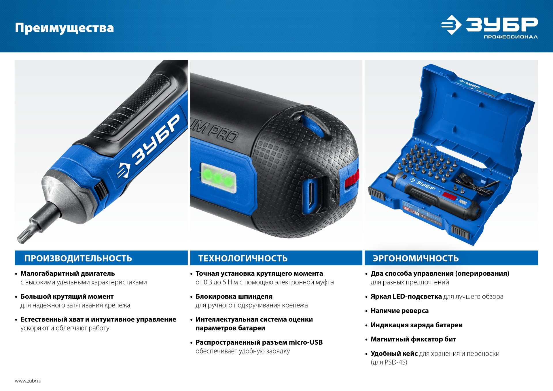 Отвертка аккумуляторная Зубр PSD-4, серия «профессионал»