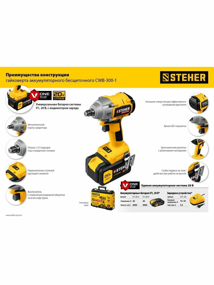 Бесщеточный гайковерт, кейс (CWB-300-1) STEHER V1, 20 В, 300 Н·м, 1 АКБ (4 А·ч)