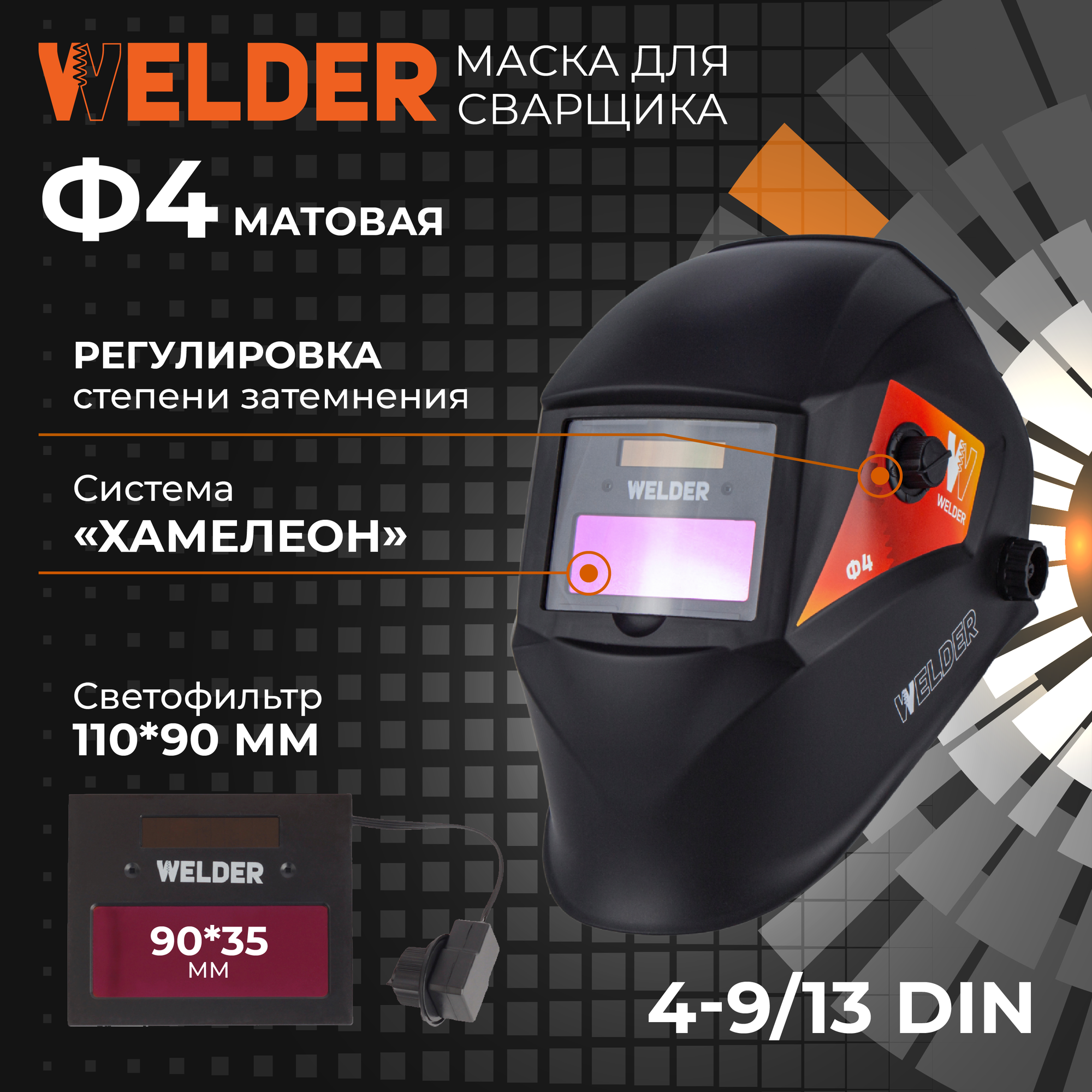 Маска сварочная WELDER PRO Ф4 Хамелеон 90x35 мм, DIN 9-13 (Внеш. регул), матовая, в коробке интересное: