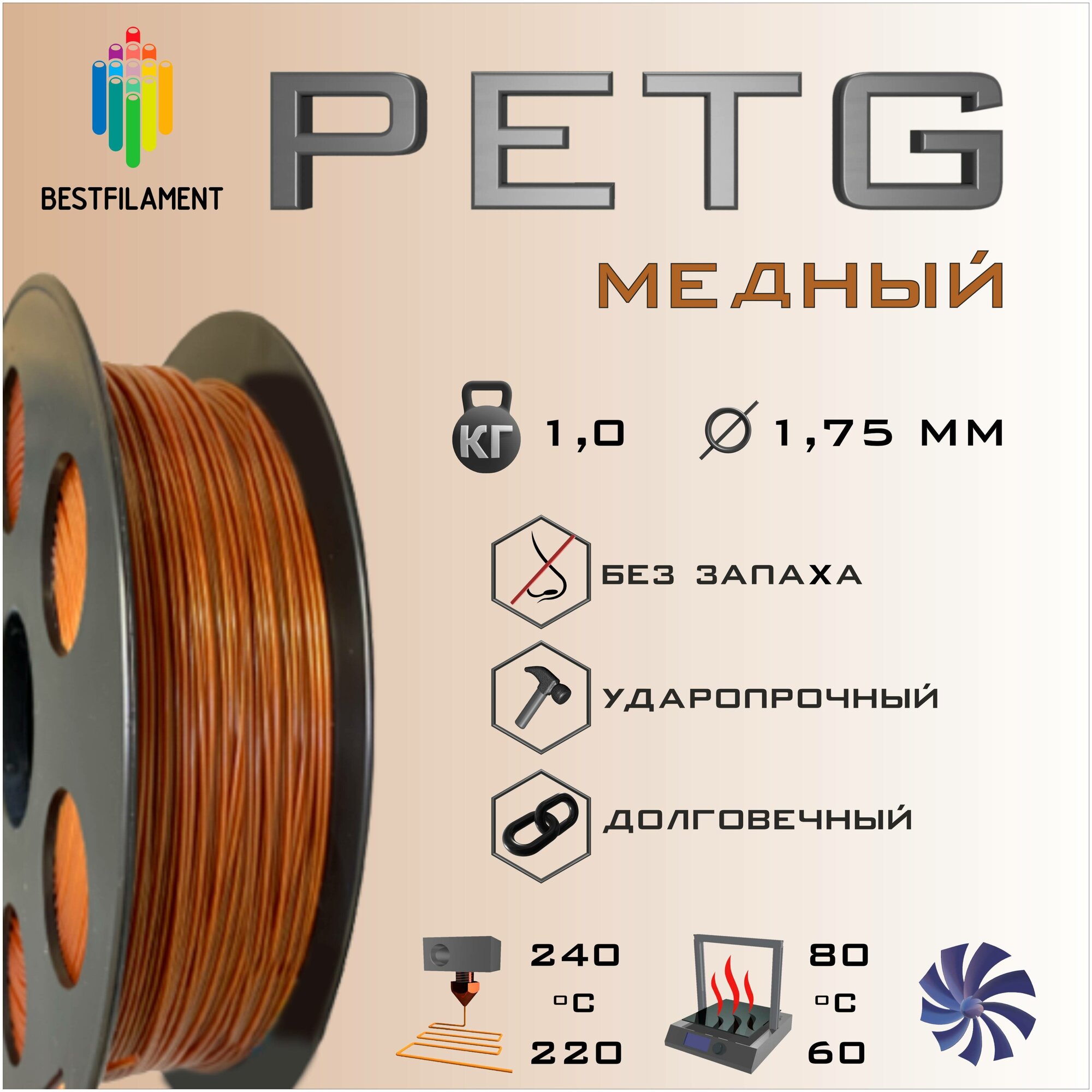 Купить PETG Медный 1000 гр. 1.75 мм пластик Bestfilament для 3D-принтера