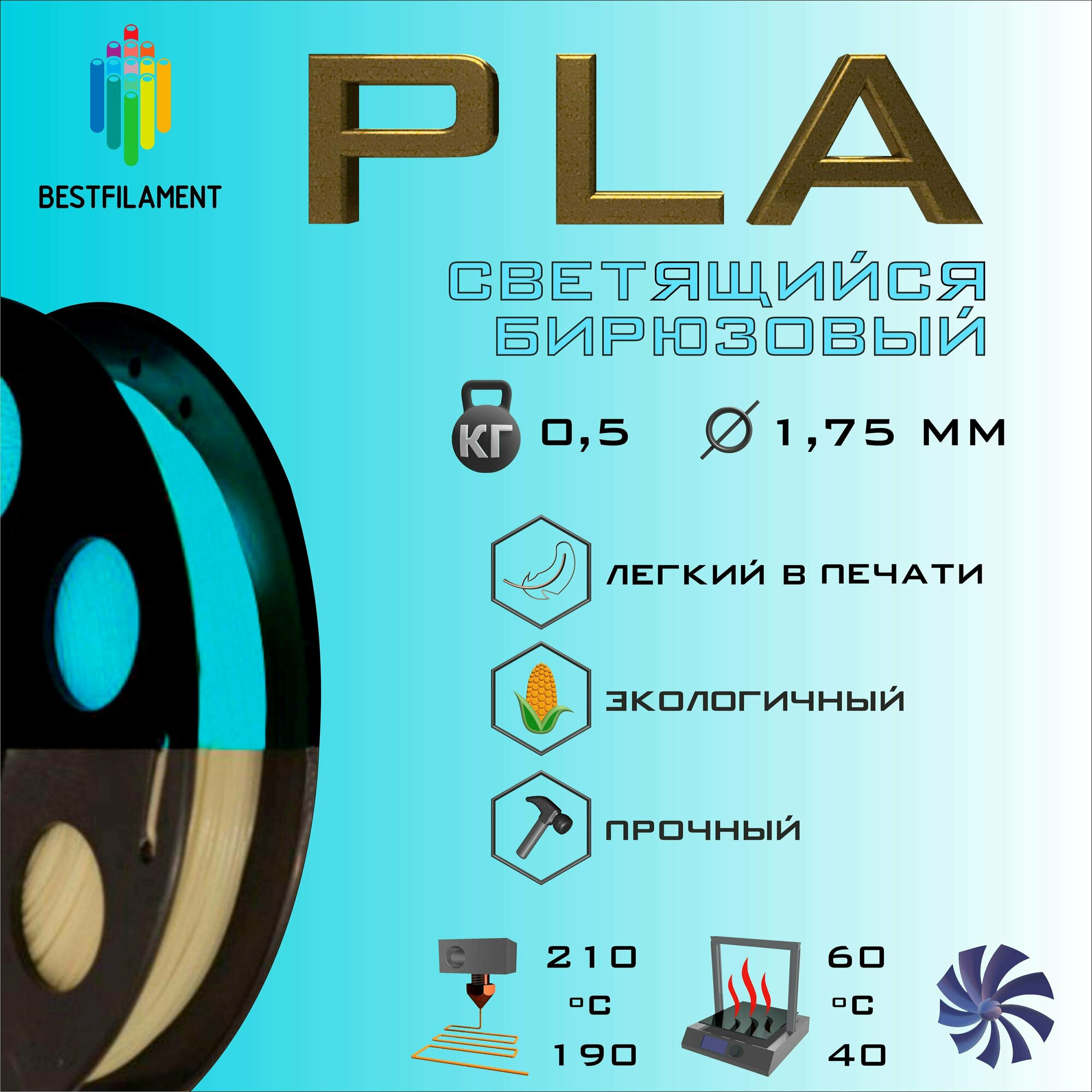Светящийся в темноте PLA пластик Bestfilament 1.75 мм для 3D-принтеров, 0,5 кг, бирюзовый