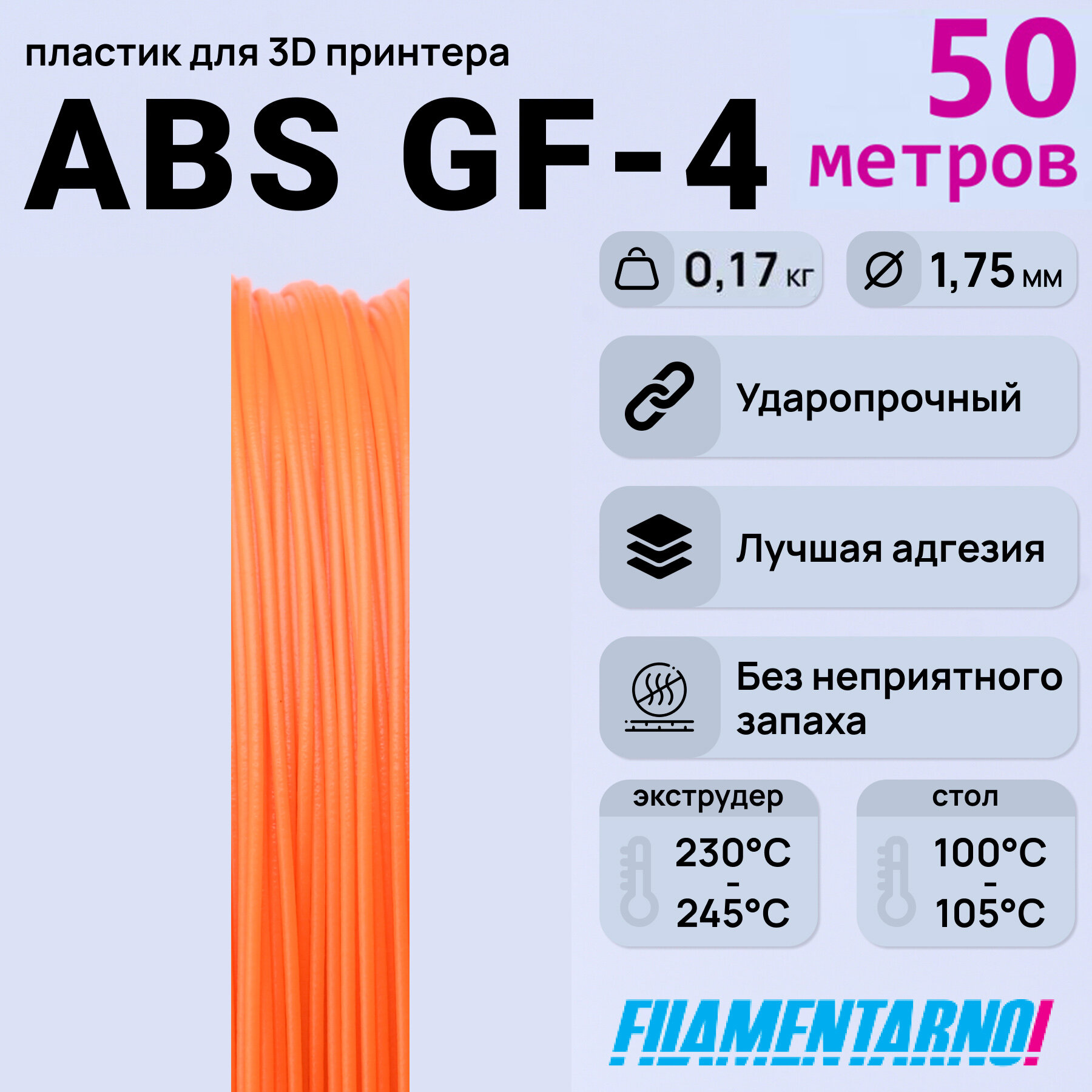 Купить ABS GF-4 оранжевый моток 50 м, 1,75 мм, пластик Filamentarno для 3D-принтера