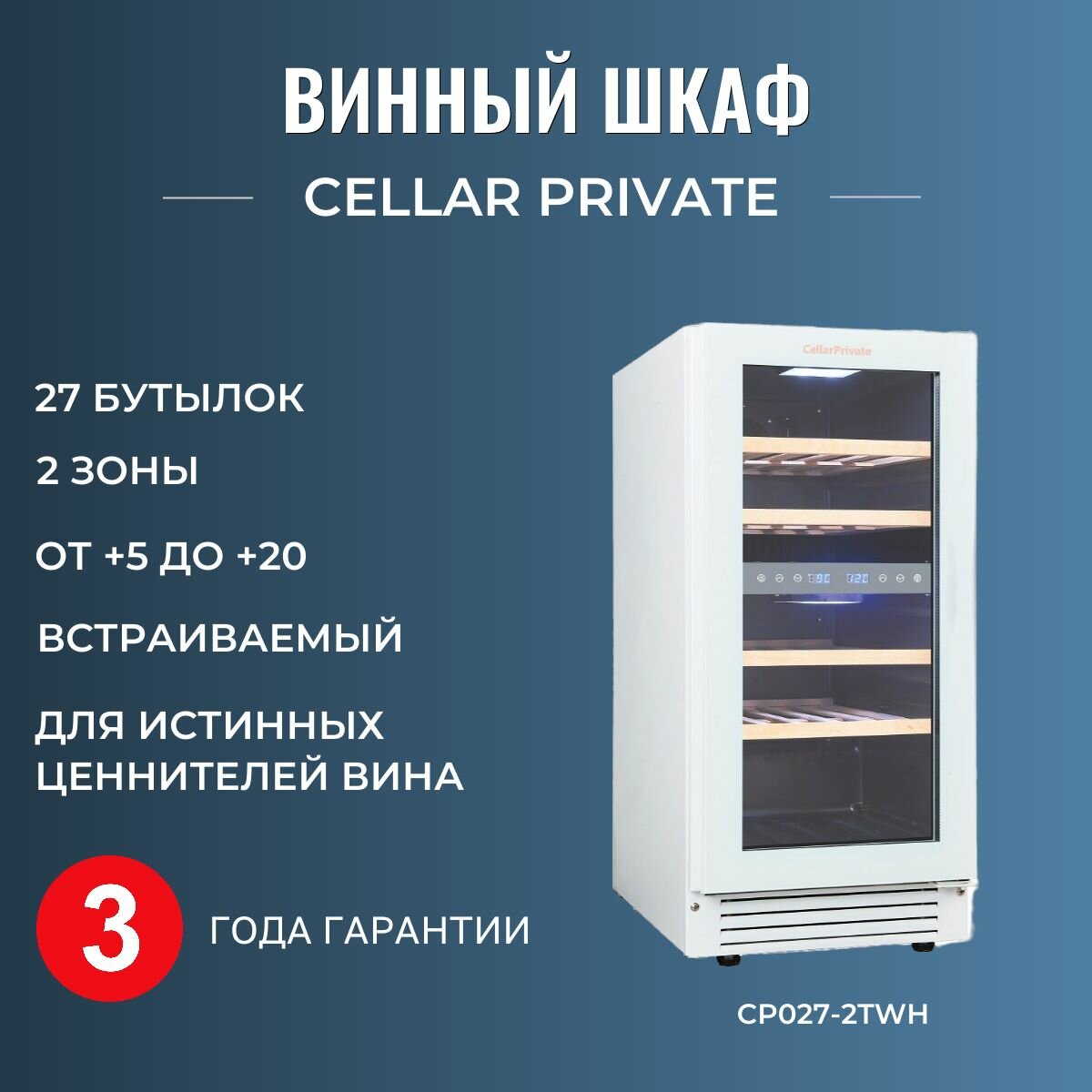 Винный шкаф Cellar Private CP027-2TWH, встраиваемый, двухтемпературный, скрытая ручка, 27бут, белый. интересное: